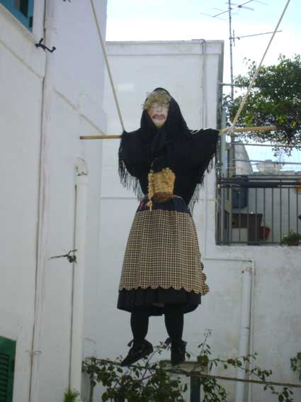 Parenti e amici si riunivano in casa, conversavano, scherzavano e, al suono della fisarmonica o del vecchio grammofono, cantavano, ballavano e gustavano qualche leccornia. Sul più bello, finti infermieri adagiavano su un tavolo un fantoccio: “la vecchia” (la donna più anziana della compagnia che, spesso, si chiamava Carolina, nome frequente a Fasano).