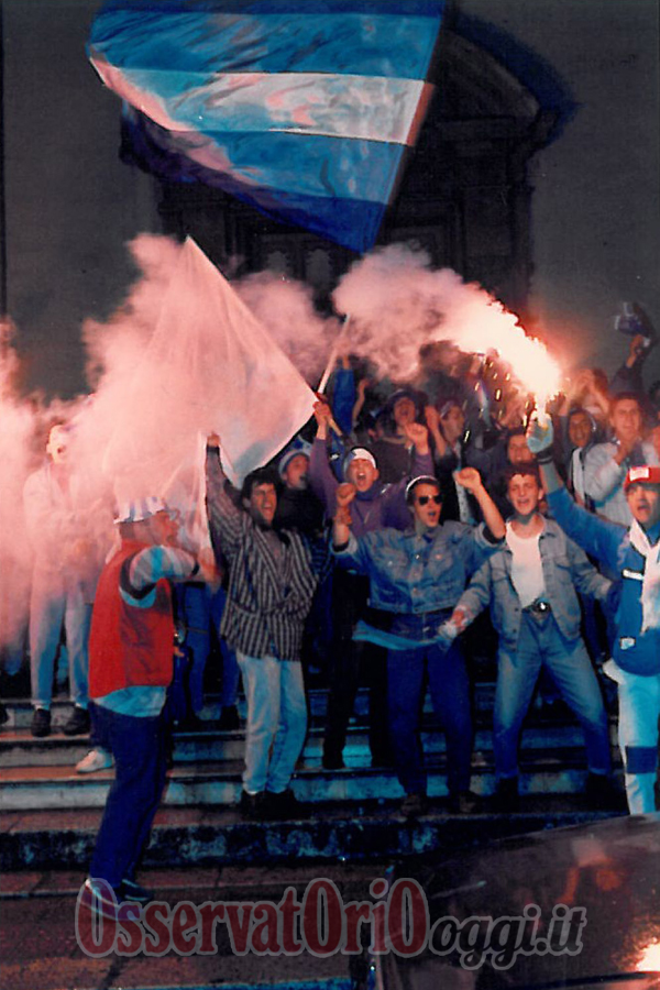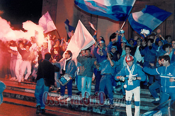 Il magico Fasano fortemente voluto da Nino Di Biase ci ha consentito di scontare tutte le magre delle stagioni scorse, di esplodere, di abbuffarci: abbiamo cominciato a festeggiare, contro tutte le previsioni già con quattro giornate d’anticipo sulla chiusura del campionato e per quattro domeniche si è ripetuto lo stesso film di caroselli di auto, sventolii di bandiere, gente impazzita, strade tappezzate di biancoazzurro. Piccoli ma gustosi assaggi prima di arrivare alla festa ufficiale di lunedi 9 maggio, organizzata dall’Amministrazione Comunale con la collaborazione dell’Azienda Autonoma di Cura Soggiorno e Turismo e del Comitato Cittadino Promotore.
