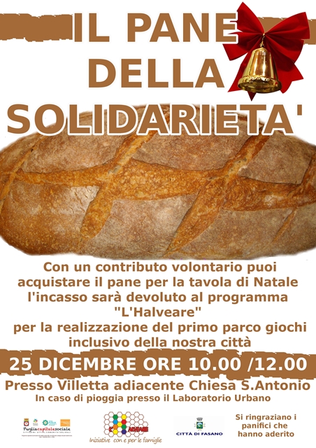 FASANO – “Il pane della solidarietà” è l’iniziativa ideata ed organizzata dalla rete associativa “L’Halveare”, nell’ambito di “Famiglie solidali”, che vede il patrocinio e la collaborazione del Comune di Fasano. L’appuntamento è per il giorno di Natale, giovedì 25 dicembre dalle ore 10 alle 12 nella villetta adiacente la chiesa di Sant’Antonio in corso Vittorio Emanuele, a Fasano.