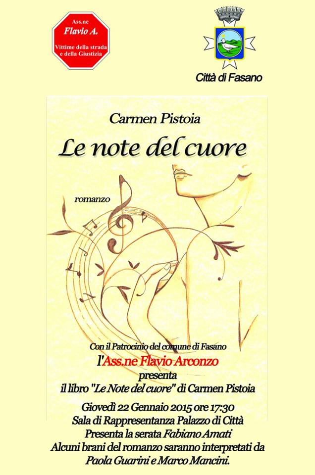 FASANO – Giovedì 22 gennaio, alle ore 17.30, nella Sala di Rappresentanza del Comune di Fasano, sarà presentato il nuovo romanzo di Carmen Pistoia, “Le note del cuore”. La presentazione, patrocinata dal Comune di Fasano, è organizzata dall’associazione "Flavio Arconzo – Vittime della strada e della giustizia". La serata sarà presentata da Fabiano Amati, mentre Paola Guarini e Marco Mancini interpreteranno alcuni brani del romanzo. Parte del ricavato della vendita dei libri sarà devoluto all’associazione organizzatrice, della quale la Pistoia fa parte come membro del Consiglio.