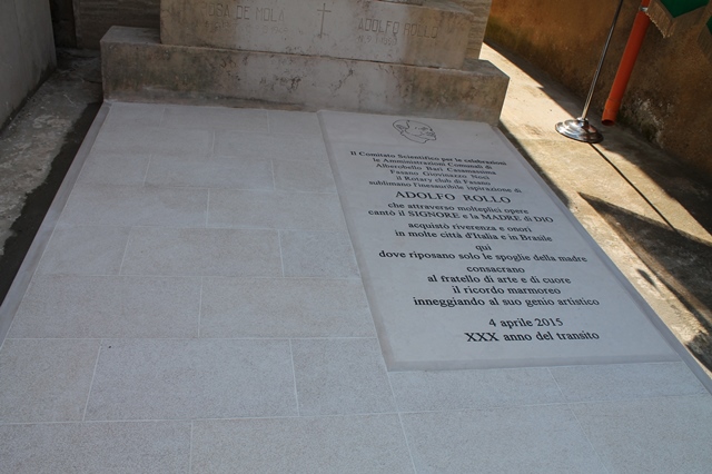 Per questo, alla cerimonia ha partecipato anche Fra’ Mariano Bubbico che lo conobbe personalmente, essendo vissuto nello stesso convento. «Sono davvero grato a chi ha potuto rendere fattibile un ricordo per il grande artista quale è stato Rollo – ha detto padre Bubbico -. Ha lasciato in tutte le città dove è stato opere di una bellezza rara che dobbiamo tramandare alle generazioni future. Rollo lavorava non per soldi ma per amore, soprattutto verso Dio. Faceva tutto col cuore e lo testimoniano le sue realizzazioni» Il sindaco Di Bari e lo stesso Belfiore hanno scoperto un’epigrafe sul loculo dov’è inciso il nome di Rollo. "Il Comitato Scientifico per le Celebrazioni le Amministrazioni comunali di Alberobello Bari Casamassima Fasano Giovinazzo Noci il Rotary Club di Fasano sublimano l'inesauribile ispirazione di Adolfo Rollo che attraverso molteplici opere cantò il Signore e la Madre di Dio acquistò riverenza e onori in molte città d'Italia e in Brasile qui dove riposano solo le spoglie della madre consacrano al fratello di arte e di cuore il ricordo marmoreo inneggiando al suo genio artistico".