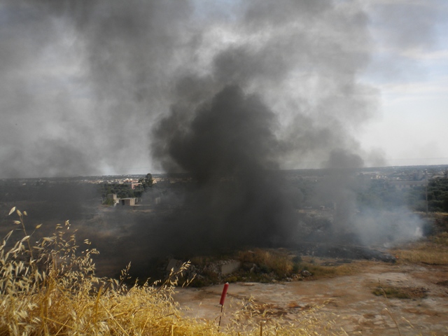 A bruciare sarebbero rifiuti, sterpaglie e, a giudicare dall'intenso colore nero del fumo, e dall'odore di gomma in fiamme, anche pneumatici abbandonati.