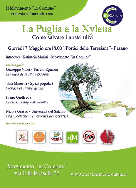 FASANO – “La Puglia e la Xylella. Come salvare i nostri ulivi” è il titolo dell’iniziativa organizzata dal movimento “in Comune” per il pomeriggio di domani (giovedì 7 maggio), ai Portici delle Teresiane di Fasano, con inizio alle ore 18. L’incontro sarà introdotto e moderato dalla dott. Katiuscia Marini, esponente del sodalizio fasanese, e vedrà in successione gli interventi del rappresentante di “Terra d’Egnazia” Giuseppe Vinci (La Puglia degli ultimi 20 anni), dei referenti di “Spazi popolari” Tina Minerva (Cronaca di un’emergenza) e Ivano Gioffreda (La cura. Esempi dal Salento), e del docente dell’Università del Salento Nicola Grasso (Una questione di emergenza democratica).