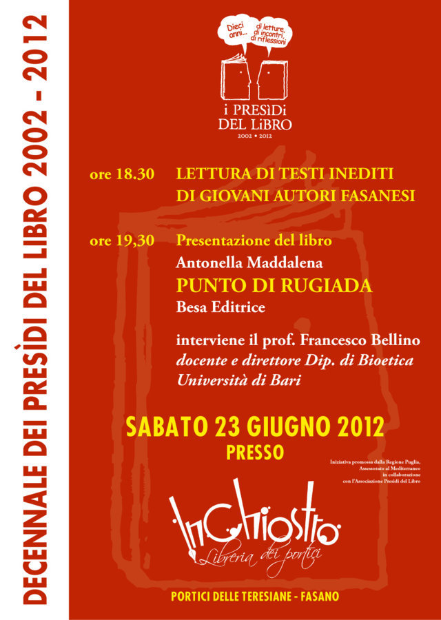 A Fasano, la presidente Anna Maria Toma ha ideato, per sabato 23 giugno, alle ore 18.30, presso la libreria "Inchiostro", una serata dedicata alla lettura di testi inediti di giovani autori fasanesi, con a seguire la presentazione del libro di Antonella Maddalena "Punto di rugiada", (Besa Editrice, collana "Comete").