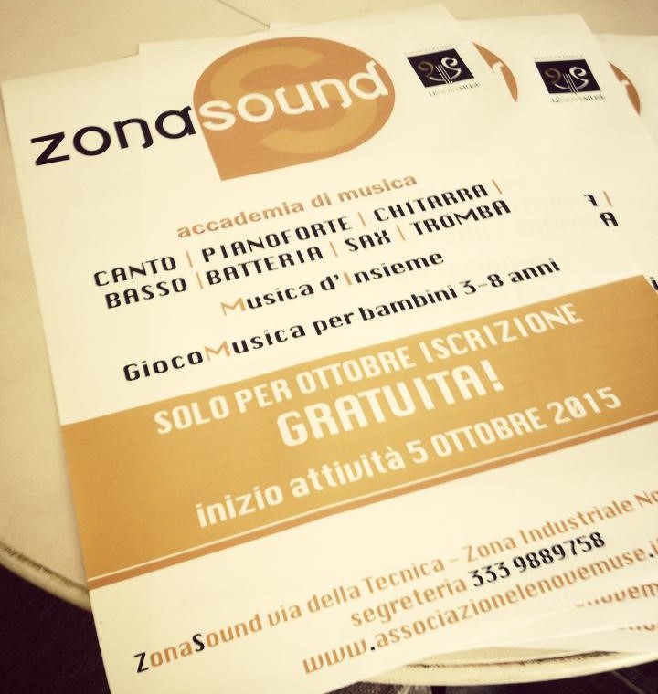 FASANO – Lunedì 5 ottobre riapriranno, per il terzo anno consecutivo, le porte dell'Accademia di Musica concepita dall'associazione culturale Le Nove Muse nella sede operativa di Zona Sound, in via sant'Oronzo, nella Zona Industriale. I corsi attivi riguarderanno l'insegnamento di pianoforte con il M° Daniele Bove, batteria con il M° Leonardo Cofano, chitarra con il M° Nicola Cataletto, canto con la M° Miriam Neglia, sax con il M° Giuseppe Sabatelli e, novità 2015, tromba con il M° Stefano Annese.