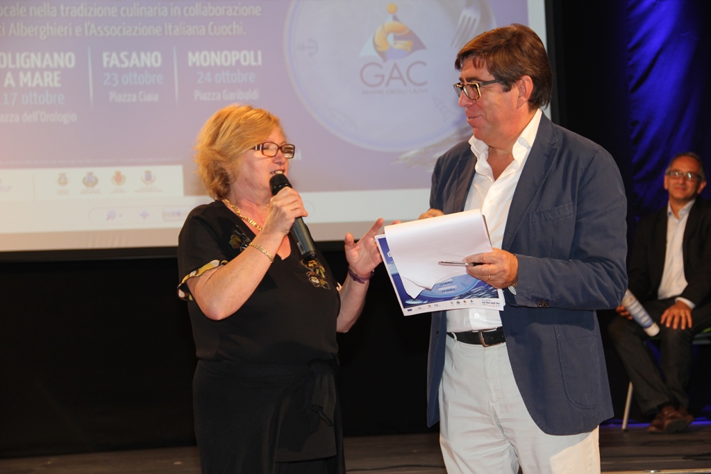 FASANO – Si è svolto ieri mattina (martedì 6 ottobre), presso il centro polifunzionale “Musica d’Attracco” a Monopoli, “Chef per un giorno”, il primo evento de “I Laboratori del Gusto – L’isola dei pescatori” promosso dal Gac “Mare degli Ulivi” (di cui fanno parte i comuni di Monopoli, Polignano a Mare, Mola di Bari e Fasano) e realizzato da Canale 7. All’iniziativa hanno partecipato il presidente del Gac “Mare degli Ulivi” Pierantonio Munno, la dirigente dell’Iiss “G. Salvemini” di Fasano Rosa Anna Cirasino, la prof.ssa Alberta Blasi (in rappresentanza di Giuseppe Vernì, dirigente dell’Ipsseoa “Angelo Consoli” di Castellana Grotte e Polignano a Mare), il presidente dell’Associazione Cuochi Bari Francesco Lanza, il presidente dell’Associazione Cuochi Brindisi Giovanni Semeraro e Vito Antonio Rinaldi dell’Associazione Cuochi “Trulli e Grotte”. Massiccia la presenza di docenti e studenti dei due istituti alberghieri coinvolti nel progetto. Sono intervenuti anche i presidenti delle cooperative di pescatori dei quattro Comuni aderenti al Gac “Mare degli Ulivi” insieme a molti operatori della pesca e rispettive signore.