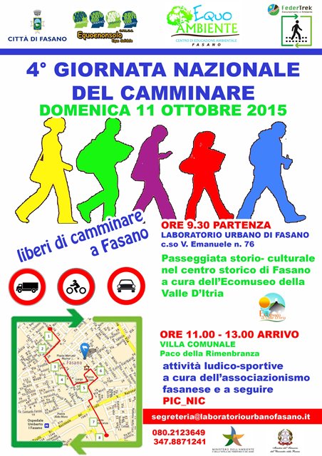 FASANO – Anche quest’anno il Centro di Educazione Ambientale EquoAmbiente ed il Comune di Fasano aderiscono alla quarta Giornata Nazionale del Camminare con il patrocinio del Ministero dell'Ambiente e la partecipazione di tantissimi comuni italiani, tra cui Milano, Roma, Genova, Firenze e Bari. La Giornata nazionale del Camminare, organizzata da Federtrek, intende promuovere il gesto del camminare, il gesto più naturale, che oltre a determinare un elemento di maggior conoscenza del territorio e della città da parte degli abitanti, rappresenta anche una grossa opportunità per modificare le proprie abitudini quotidiane apportando indubbi benefici psico-fisici con ricadute molto positive sulla qualità del vivere urbano, vista la conseguente riduzione del traffico privato dovuto proprio alla scelta di muoversi a piedi, in bici o con i mezzi pubblici.