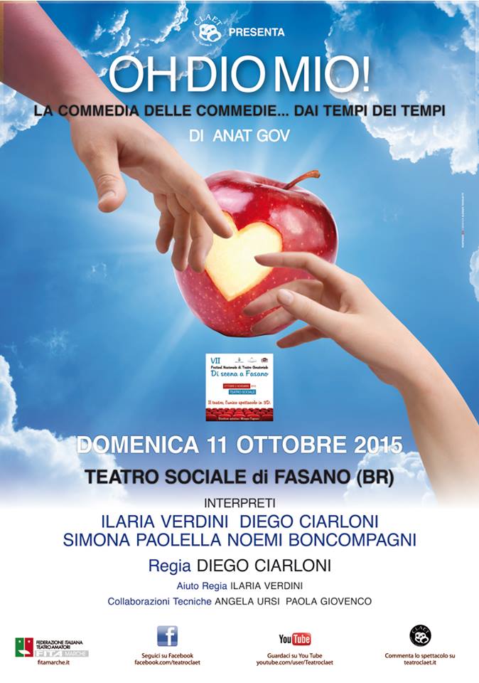 FASANO – Si aprirà domani (domenica 11 ottobre) il festival nazionale di teatro amatoriale “Di scena a Fasano”, giunto alla settima edizione e organizzato dal gruppo cittadino di attività teatrali “Peppino Mancini” e dal Comune di Fasano, con la partecipazione della “Uilt” (Unione Italiana Libero Teatro): il primo spettacolo in gara sarà “Oh Dio mio!” di Anat Gov rappresentato dalla compagnia “C.L.A.E.T.” di Ancona con la regia di Diego Ciarloni.