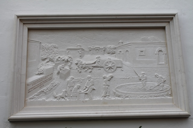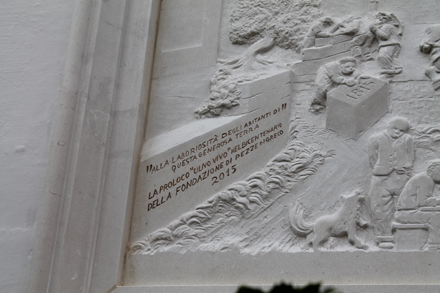 L’opera in pietra è stata realizzata dall’artista Donatello Grassi che nel suo intervento a spiegato dettagliatamente il perché della scelta del materiale pietroso: l'opera resterà indelebile nel tempo. Scene di vita contadina e artigianale sono i protagonisti in primo piano dell’opera che sul suo sfondo ha rappresentata una masseria, quest’ultima chiaro richiamo alla struttura di proprietà del signor Greco, fondatore del paese. Un lavoro voluto sin dall’inizio di questo 2015 dal Comitato fondato per i festeggiamenti, guidato da Orazio Rubino e dalla Pro Loco della frazione “Ulivo Vivo” presieduta da Peppino Palasciano (quest'oggi assente a causa di un gravissimo lutto familiare). È stato proprio Rubino che nel suo saluto iniziale ha voluto sottolineare come l’opera possa essere una traccia nella memoria del paese. Lo stesso Rubino ha poi spiegato l’importanza del luogo dove il bassorilievo è stato posto, un luogo dove gran fetta di storia della frazione è stata scritta in quanto primo edificio pubblico.