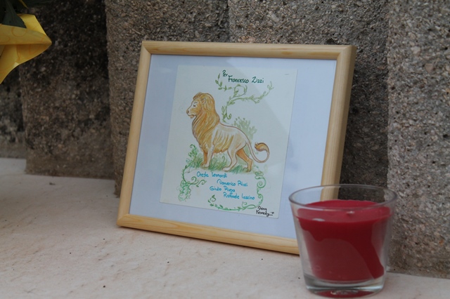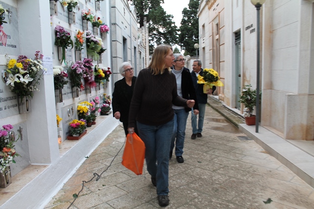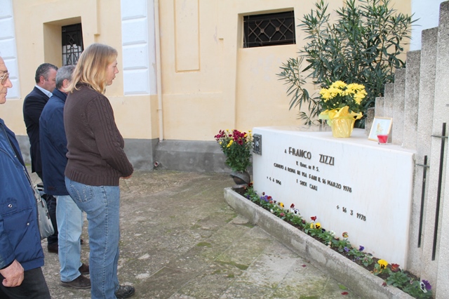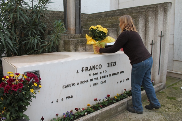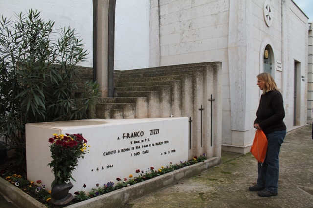 E una delle ultipe tappe di questo estenunate viaggio è stata Fasano. Diane Kennedy e il suo Gamin sono già da due giorni nella nostra città legata a doppia mandata alla vicenda Moro. Diane lo ha saputo naturalmente. Infatti ieri (sabato 31 ottobre) si è recata al cimitero fasanese per deporre sulla tomba di Franco Zizzi, il giovane fasanese facente parte della scorta di Moro trucidata in via Fani, dei fiori, un disegno da lei stessa realizzato raffigurante un leone e riportante i nomi degli uomini della scorta e un cero. Era accompagnata da alcuni professionisti baresi che da tempo ne seguono le vicende e che, grazie ad una rete di contatti intessuta su Facebook, cercano di dare sostegno all'obiettivo della Kennedy. Il "gancio" fasanese è stato l'imprenditore Enzo Cardone. Ieri sera, poi, all'Oasi di S. Giovanni Battista a Montalbano, Diane Kennedy ha avuto modo di far conoscere ad alcuni ospiti i suoi disegni e la sua storia.
