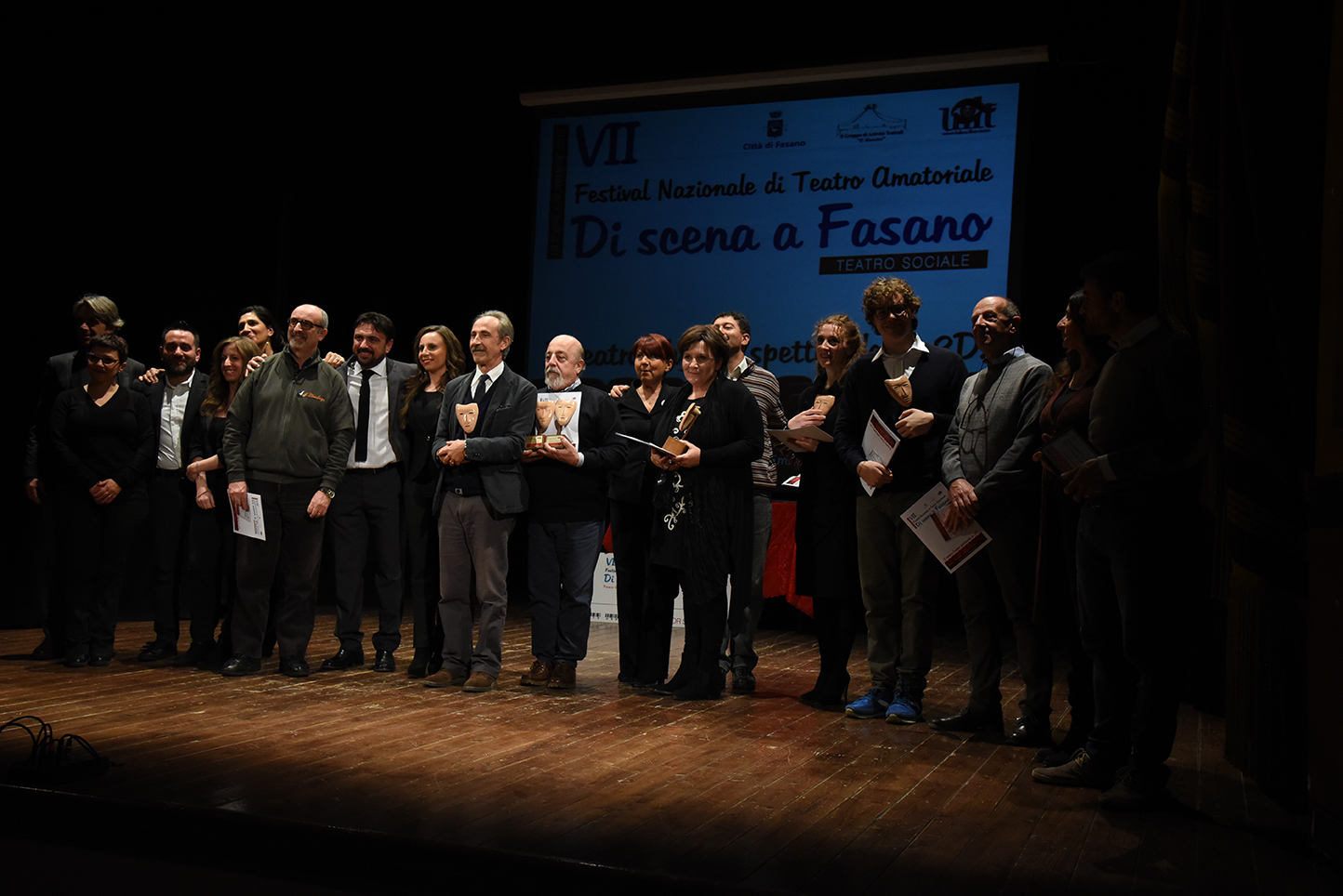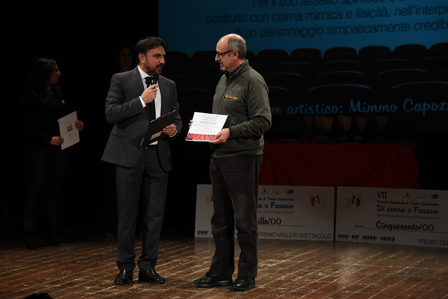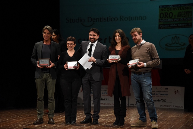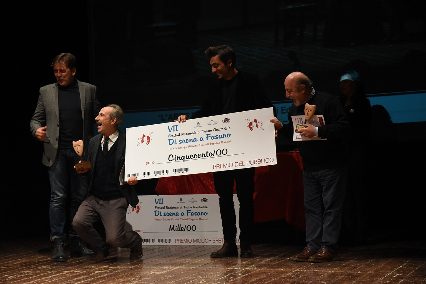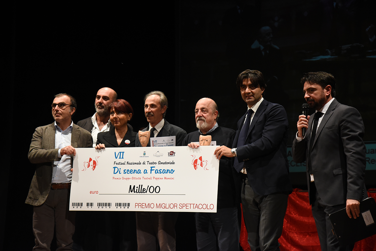 FASANO – Il festival nazionale di teatro amatoriale “Di scena a Fasano” si è brillantemente concluso ieri sera (domenica 22 novembre) con una piacevole cerimonia di premiazione: ancora una volta, sul palcoscenico del Teatro Sociale, l’arte della recitazione ha ricevuto i dovuti riconoscimenti. La rassegna, organizzata dal gruppo cittadino di attività teatrali “Peppino Mancini” e diretto sapientemente da Mimmo Capozzi, ha chiuso una settima edizione di successo, riguardo al numero di spettatori e alla qualità delle sei pièce, ma di crisi, in merito ai mancati finanziamenti da parte dell’amministrazione comunale: la messa a punto della manifestazione, infatti, è stata possibile solo grazie alla vendita degli abbonamenti e ai patrocini dello Studio dentistico Rotunno, del Banco Metalli italiano e del sostegno di Cupertino abbigliamento e Masseria Casaburo.