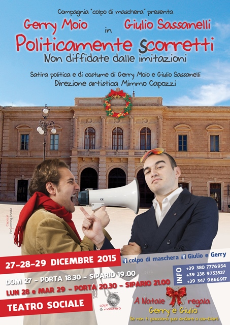 FASANO – Il Natale è alle porte e la politica locale sembrerebbe assopita nel clima festivo della città, se non fosse per l’appuntamento teatrale dei prossimi 27, 28 e 29 dicembre, giorni in cui andrà in scena “Politicamente scorretti”, show di satira politica e di costume, targato Compagnia colpo di maschera. Sul palco del Teatro Sociale di Fasano si esibiranno, con le loro esilaranti imitazioni, “Non diffidate dalle imitazioni” è appunto il sottotitolo dell’evento, Gerry Moio e Giulio Sassanelli, duo comico molto apprezzato a Fasano. Moio e Sassanelli, diretti nuovamente da Mimmo Capozzi dopo il fortunato spettacolo di cabaret “Non lasciateli da soli”, sono reduci dalla seconda edizione di Rido Diaconia Show, programma radiofonico brillante molto seguito e apprezzato dal pubblico di casa.