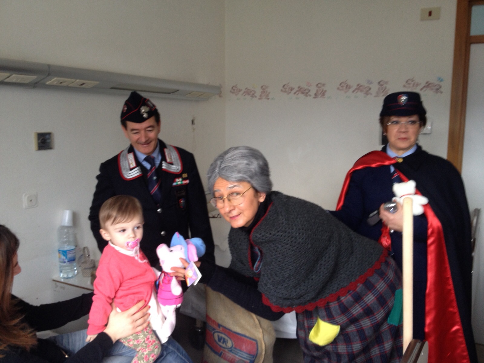 FASANO – Una simpatica "nonnina", molta allegria, tanti dolci per i bambini. La Befana si è recata questa mattina (mercoledì 6 gennaio) a far visita ai bambini ricoverati nel reparto di Pediatria dell'Umberto I di Fasano. A organizzare la simpatica ed emozionante iniziativa la locale sezione dell'Associazione Nazionale Carabinieri presieduta da Adriano Losavio. Puntualissima, la “vecchina” con i capelli grigi ha fatto la sua comparsa nelle stanze pediatriche del nosocomio fasanese accompagnata dagli organizzatori dell’evento e il personale sanitario del reparto, col dottor Franco Mastro in testa. «Davvero meraviglioso – ha commentato Mastro -. Una splendida Befana che ha rallegrato i nostri piccoli pazienti. Ringrazio a nome del reparto gli organizzatori e abbraccio tutti con enorme felicità. Oggi anche io sono tornato bambino»,
