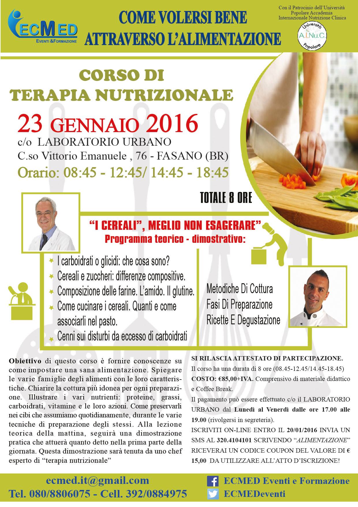 FASANO – Sabato 23 gennaio, al Laboratorio urbano di Fasano, si terrà il corso di terapia nutrizionale organizzato dall'azienda di eventi e formazione EcMed: per l'occasione saranno presenti il dott. Silvio Spinelli e lo chef Angelo Biscotti. Il corso ha una durata di 8 ore: si svolgerà dalle 8.45 alle 12.45 e dalle 14.45 alle 18.45.