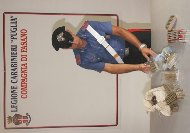 L'uomo, in seguito ad una perquisizione domiciliare eseguita presso il box auto in suo uso e preso in locazione da G.A., 36enne da Pezze di Greco, è stato trovato in possesso di n. 1175 proiettili di vario calibro di cui 93 cal. 9 parabellum, un artifizio lanciarazzi modificato ad arma comune da sparo cal. 22, due banconote da 100 euro contraffatte, 1 grammo di cocaina, 500 grammi di sostanza da taglio del tipo "lidocaina", vario materiale per il confezionamento della droga e la somma contante di 2.500,00 euro, provento dell'attività di spaccio, il tutto sottoposto a sequestro.