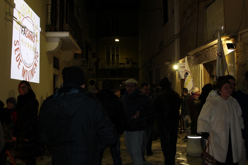 Trisciuzzi, da parte sua, ha sottolineato l'importanza del momento. "Stiamo gettando un sassolino nello stagno perché c'è acqua stagnante a Fasano e questo rischia di rovinare anche l'aria della nostra bella città – ha esordito quello che viene additato come il candidato sindaco pentastellato -. Con questa iniziativa stiamo cercando di stimolare la partecipazione, la condivisione attraverso l'autoorganizzazione e l'autofinanziamento. La nostra sede è completamente autofinanziata grazie alla buona volonta di cittadini che hanno sottratto tempo alle loro professioni e ai loro affetti familiari. Ed è già bello il fatto che cittadini si organizzino e diano vita a qualcosa di nuovo, ad un cambiamento che potrà essere attuato solo se i cittadini si rimboccheranno le maniche. Come Movimento 5 Stelle abbiamo capito che il nostro essere cittadini è una grande responsabilità. Occuparsi della propria città non significa occuparsi del proprio orto ma sostituire l'impiego personale con quello pubblico. Immagino un giorno di poter passeggiare in bicicletta su una pista ciclabile, di sedermi su una panchina alla Selva e ammirare il panorama, di stare all’ombra di un albero in una piazza Mercato vecchio sgombra da automobili».