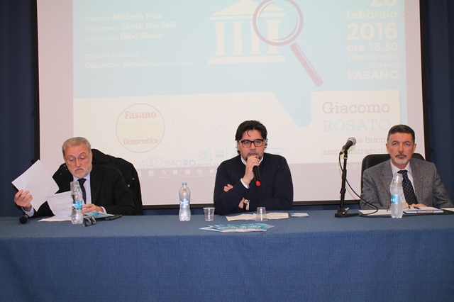 FASANO – Gli argomenti non erano certo dei più facili anche se attuali e importanti. La trasparenza amministrativa, il ruolo dell'amministratore locale e i suoi doveri verso la cittadinanza, in questo periodo in cui il mondo politico è bersagliato da vicende giudiziarie, potevano sembrare temi impopolari. Ma l'incontro organizzato ieri pomeriggio (venerdì 26 febbraio), al Laboratorio Urbano di Fasano, da "Fasano Democratica" ha invece dimostrato di come la gente abbia bisogno anche di sapere di più su come si amministra un ente locale. Vuoi per l'esperienza e la professionalità dei relatori Dino Musa e Sante Nardelli, vuoi per l'appeal che il candidato sindaco Giacomo Rosato sta conquistando giorno dopo giorno non solo negli ambienti politici locali (la sua coalizione va ingrossandosi di ora in ora) ma anche tra i cittadini, l'iniziativa ha visto la partecipazione di tanta gente. Il che non è facile quando, appunto, ci si trova di fronte ad argomenti di natura politica.