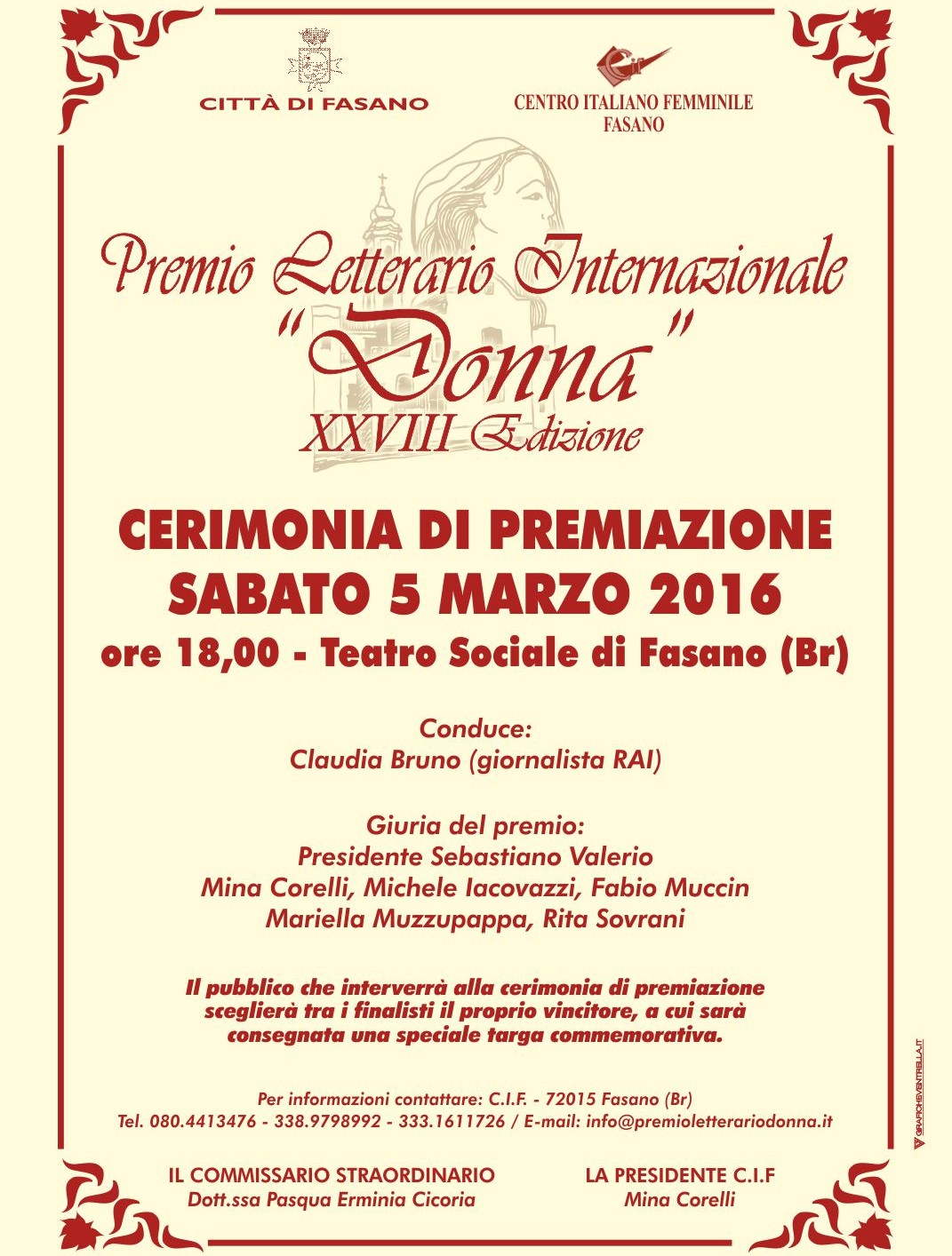 FASANO – Sabato 5 marzo il Teatro Sociale di Fasano ospiterà la XXVIII edizione del Premio Letterario Internazionale “Donna”, indetto dal Centro Italiano Femminile cittadino con il patrocinio comunale. Il concorso è cresciuto sempre più nel corso del tempo e ha avuto anche l’onore di ricevere un importante riconoscimento da parte del Presidente della Repubblica, che ha voluto conferire alla manifestazione una medaglia di rappresentanza «perché contribuisce alla promozione umana, sociale e culturale della donna, ponendola al centro non di drammatici vittimismi ma di costruttivi punti di vista».