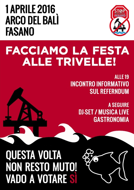 Questo significa – si legge ancora – che non solo si continua ad estrarre petrolio e gas ma lo si fa con materiale sempre più vetusto, sempre più a rischio di cedimento, di rottura, aumentando così il pericolo di incidenti e di inquinamento grave e duraturo delle nostre coste. Non lasciamo che grandi multinazionali continuino per decenni a fare profi tti mettendo a repentaglio il nostro mare, il nostro ambiente, le nostre risorse come turismo e pesca. Con un SÌ deciso il 17 aprile faremo capire alle multinazionali e ai governi attuali e futuri da che parte stiamo: il popolo italiano si oppone allo sfruttamento privato del bene comune".