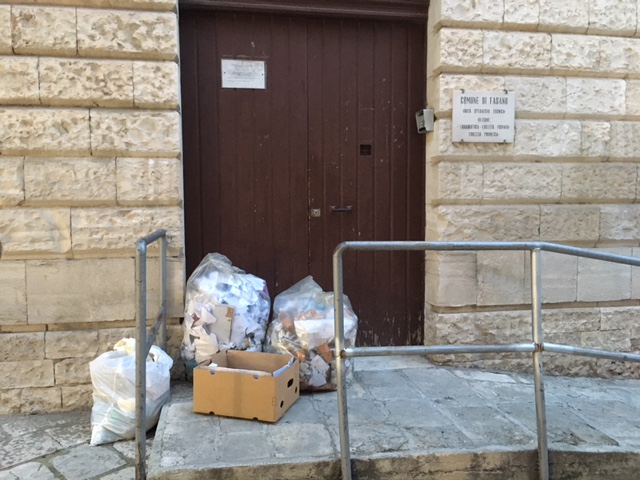 FASANO – I cattivi esempi giungono da chi meno te l'aspetti. Questa l'amara considerazione di un lettore di Osservatoriooggi.it che ha inviato in redazione alcune foto che testimoniano come, in alcuni uffici comunali, si presti poca attenzione alla raccolta differenziata. L'attento cittadino ha immortalato ieri sera (venerdì 1° aprile) alcune grandi buste lasciate davanti all'uscio dell'ufficio urbanistica. I sacchetti, essendo trasparenti, mostrano tutto il loro contenuto. Ed ecco quindi l'amara sorpresa: sono colmi per lo più di carta ma essendoci anche dei bicchieri di plastica usati ecco che il tutto è diventato materiale indiffernziato che è stato raccolto questa mattina (sabato 2 aprile). A lasciare i bustoni saranno stati gli addetti alle pulizie che avranno svuotato i cestini dislocati nei vari uffici. Ma ci si chiede se, magari con una maggiore attenzione, tutta quella carta non avesse potuto essere riciclata meglio non facendola finire tra i rifiuti indifferenziati.