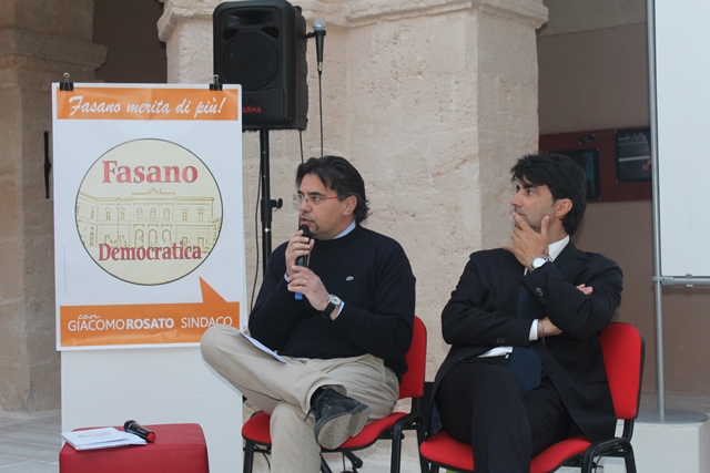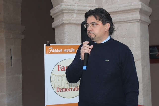 Poi la parola è passata al candidato sindaco Giacomo Rosato. «Sono contento del lavoro fatto dagli amici di Fasano Democratica – ha esordito Rosato -.. Oltre ad aver messo insieme una squadra con tanta quantità ha soprattutto tanta qualità». Il candidato sindaco ha ricordato i suoi inizi proprio in Fasano Democratica quando, nel 2007, accettò l’invito di Emanuele Vinci a candidarsi al consiglio comunale per portare avanti un progetto di buona amministrazione. Già da allora, con la guida dell’avvocato Dino Musa e Salvatore Ferrara, Rosato mosse i primi passi in assise. «Inizialmente ho ascoltato quello che accadeva in consiglio – ha continuato il candidato sindaco – in quanto in assise vi erano tanti consiglieri esperti. E io da loro ho imparato la correttezza dei rapporti prima e successivamente l’impegno e l’onestà da applicare nella politica. Mi sono nutrito di quelle buone azioni e ho cominciato piano piano a ritagliarmi un mio ruolo in consiglio. Sono diventato più interventista, ho presentato molte proposte analizzando il problema e proponendo la soluzione. Non da solo ma col gruppo di Fasano Democratica e altri amici. Per un candidato sindaco ogni singola sua lista ha un significato oggettivo importante ma consentitemi un valore affettivo superiore per questa lista. Ora ci accingiamo a fare la buona amministrazione. Cosa intendiamo? Tutto il contrario di quello che è accaduto in questi ultimi anni. Per buona amministrazione intendiamo l’operare indistintamente su tutto il territorio comunale e non, come qualcuno fa, sceglierne solo una parte. Non ci devono essere occhi di riguardo. Cosa deve fare un buon amministratore? Non deve sprecare risorse pubbliche. Purtroppo questo è accaduto in questi anni. Noi ottimizzeremo tutto quello che c’è da ottimizzare evitando sprechi. E siamo sicuri che con il vostro aiuto riusciremo nell’intento di portare a Fasano un’amministrazione partecipata, trasparente ed efficace».