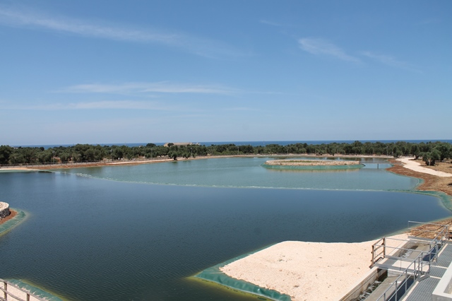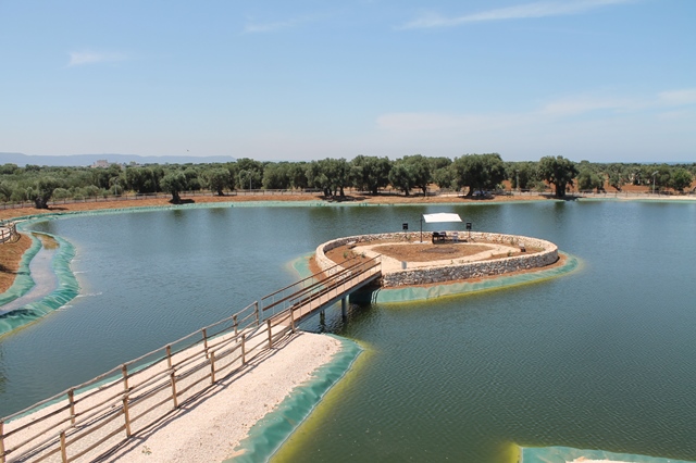 I “reattori”, meccanismi di ultimo stadio di affinamento dell’acqua, sono racchiusi in un edificio chiamato “masseria” perché costruito per mimetizzarsi nell’ambiente circostante secondo i canoni dell’architettura della zona, invece di essere contenuti in un anonimo capannone industriale. Da qui, un ruscello alimenta i bacini che presentano al centro due isole artificiali. La costruzione è stata pensata nel 1990, un finanziamento regionale e europeo ha permesso di completare i lavori e già si pensa a un modulo per la potabilizzazione.