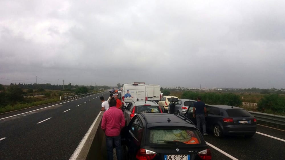 Un'automobilista è rimasto bloccato col suo mezzo in messo al fango e ha dovuto mettersi in salvo sul guard-rail dopo essere uscito dall'abitacolo. E' stato soccorso da altri automobilisti. Sotto accusa i canali di scolo poco puliti.
