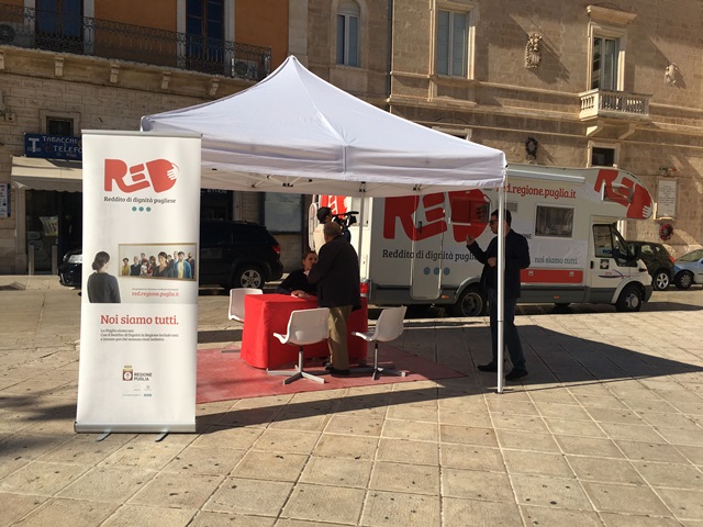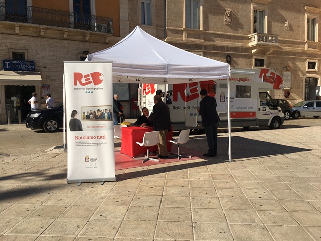 FASANO – Ha fatto tappa ieri mattina (mercoledì 19 ottobre), in piazza Ciaia a Fasano il camper informativo della Regione Puglia sul Red, sigla che sta per reddito di dignità, uno strumento della Regione contro la povertà, che viene incontro alle persone delle fasce deboli disagiate sul piano economico. E' stato allestito un gazebo all'interno del quale i cittadini hanno potuto ricevere tutte le informazioni possibili su questa nuova misura voluta la scorsa estate dalla Regione Puglia.
