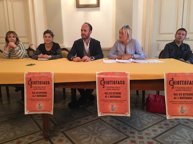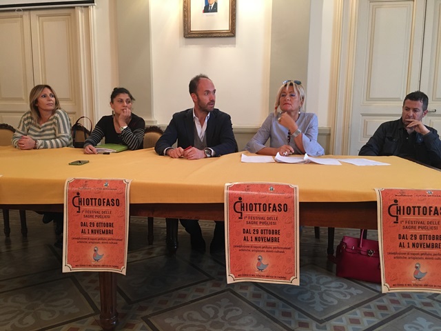 FASANO – “GhiottoFaso”, la festa d’autunno fra musica e gastronomia organizzata dal Comune di Fasano e da “MusicaEventi” che si terrà nel centro cittadino dal 29 ottobre al 1° novembre, dalle ore 19 alle 24, è stata presentata oggi in conferenza stampa, nella Sala di rappresentanza del Palazzo municipale. È toccato al sindaco Francesco Zaccaria introdurre la presentazione dell’evento, parlando di «un appuntamento di grande qualità – ed aggiungendo – che l’averne affidato una parte importante dell’organizzazione ad un soggetto privato ci consentirà un risparmio per le casse comunali di 20mila euro rispetto a “GustoSia”, la manifestazione tenutasi negli anni scorsi nello stesso periodo e sostenuta dal Comune. La progettazione dell’evento è stata curata in ogni dettaglio grazie ad un gioco di squadra – ha sottolineato il sindaco – fra l’Amministrazione comunale, in primis l’assessora Luana Amati, ed il soggetto privato. Siamo orgogliosi di quanto fatto, per noi è una scommessa che siamo sicuri di vincere».