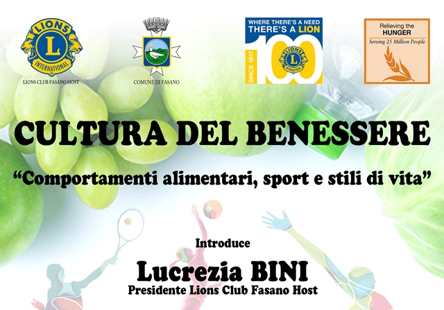 FASANO – Si terrà sabato 10 dicembre alle ore 19,30 a “Masseria Maccarone” in contrada Carbonelli a Fasano, il convegno dal titolo “Cultura del benessere, comportamenti alimentari, sport e stili di vita", che fa parte delle iniziative del calendario delle iniziative proposte dal Lions Club Fasano Host per l’anno sociale in corso. Il convegno, aperto alla cittadinanza, sarà un momento per fare il punto sui corretti stili di vita, sull’attività sportiva e la sana alimentazione, per dare informazione in merito ai positivi effetti che tali comportamenti possono indurre in termini di vita.