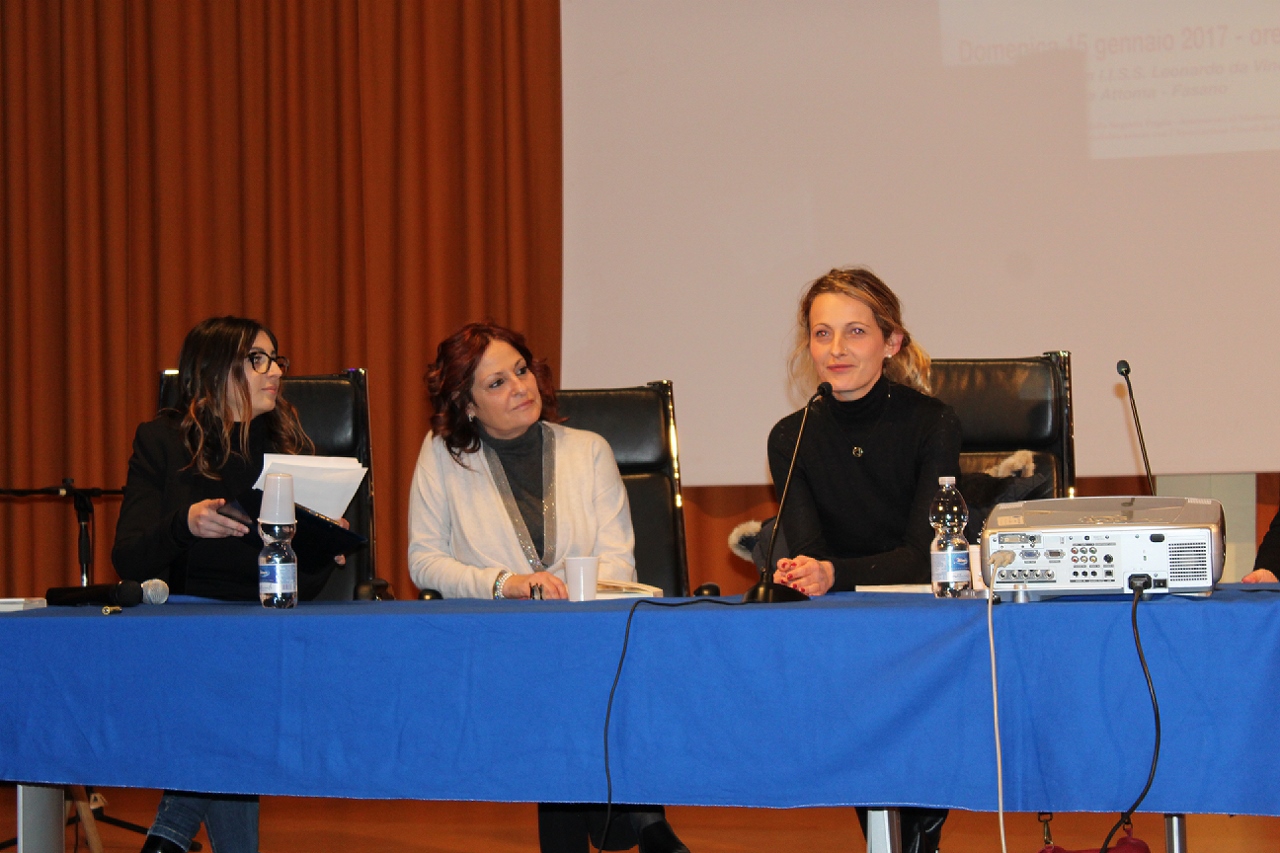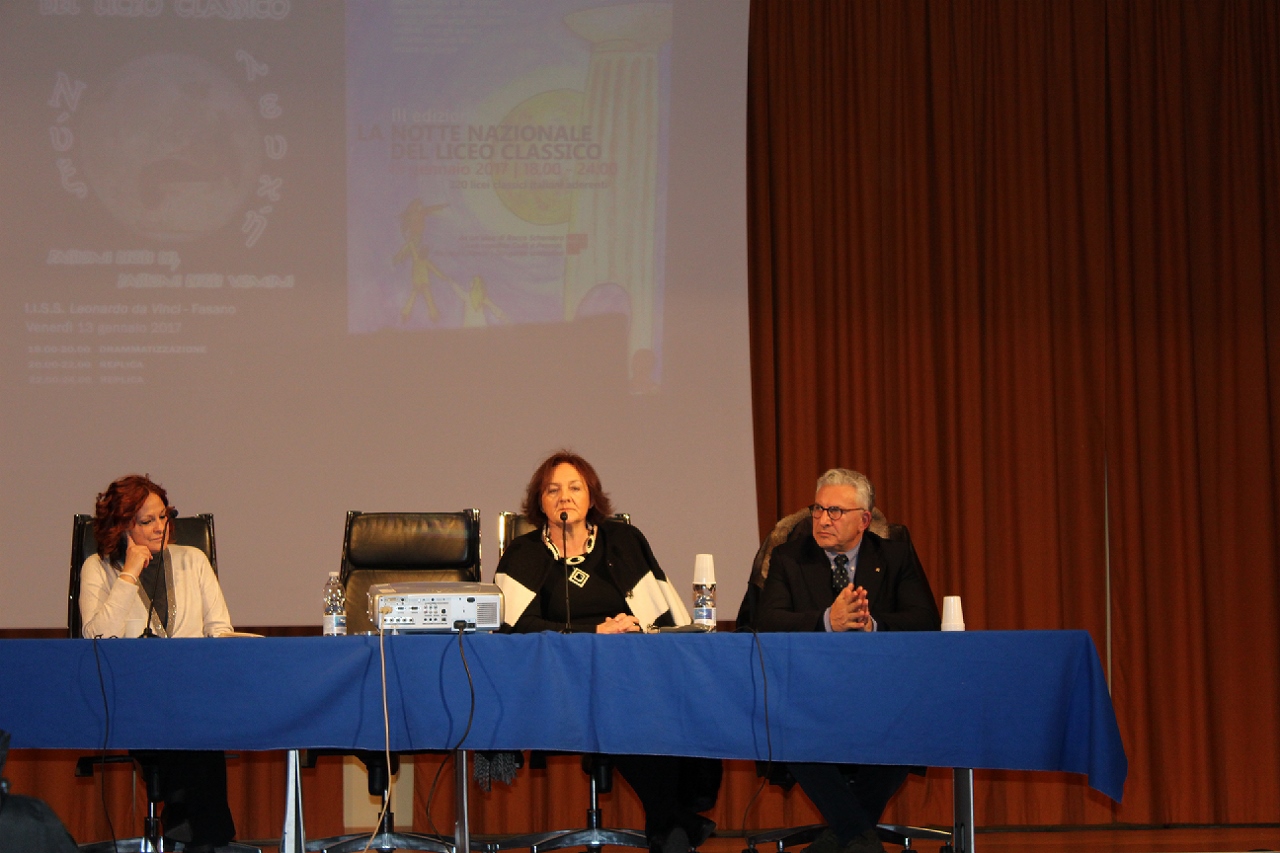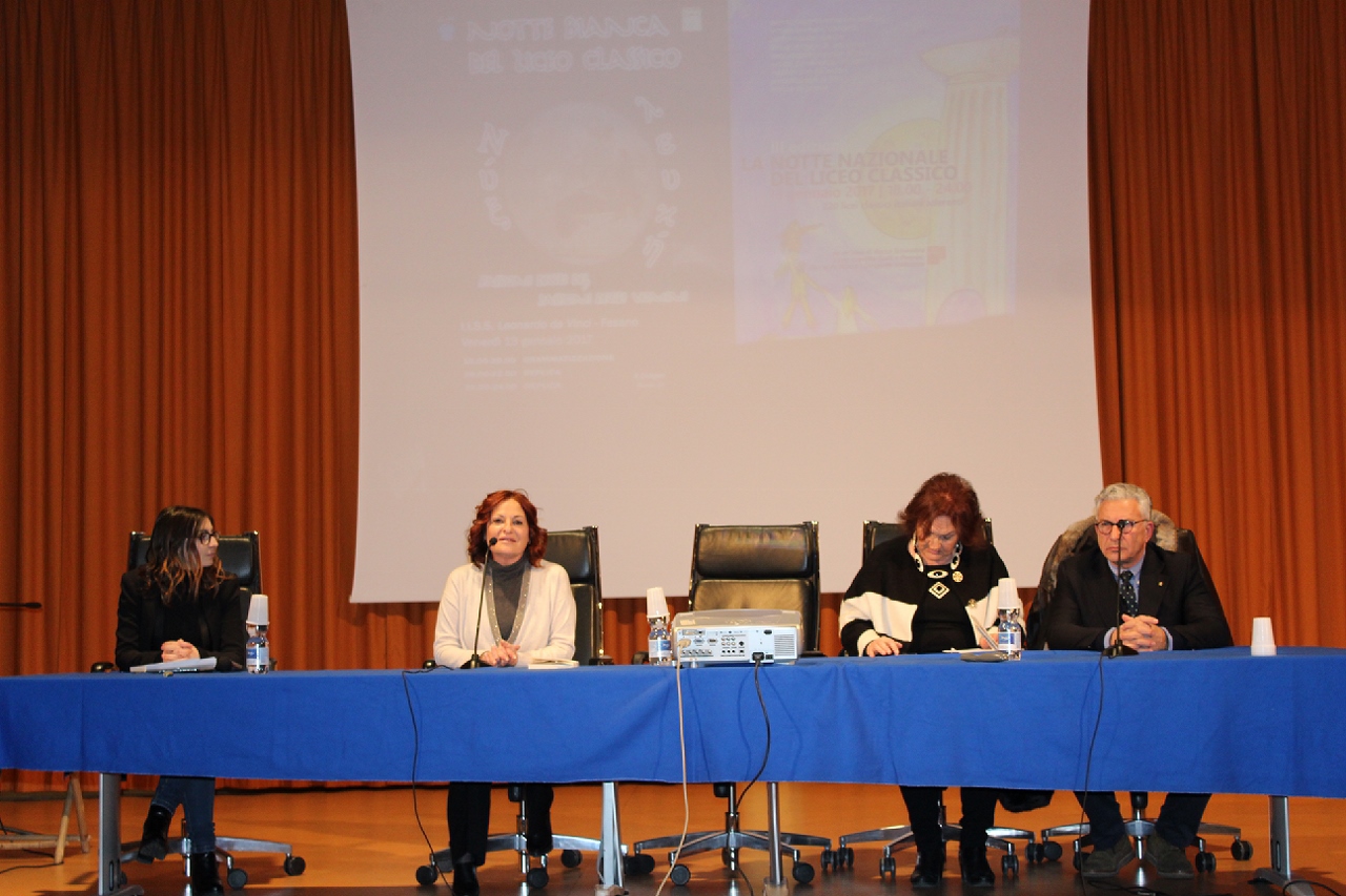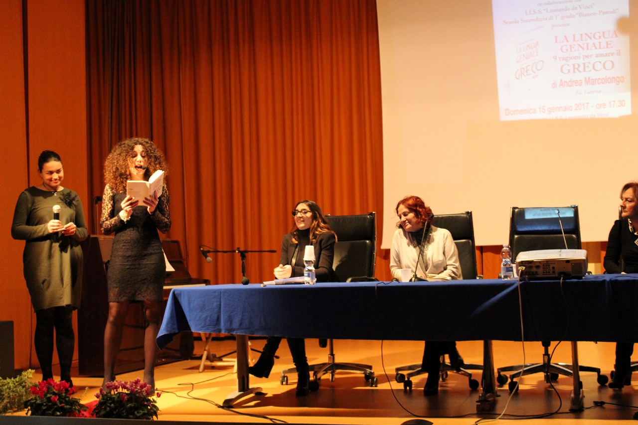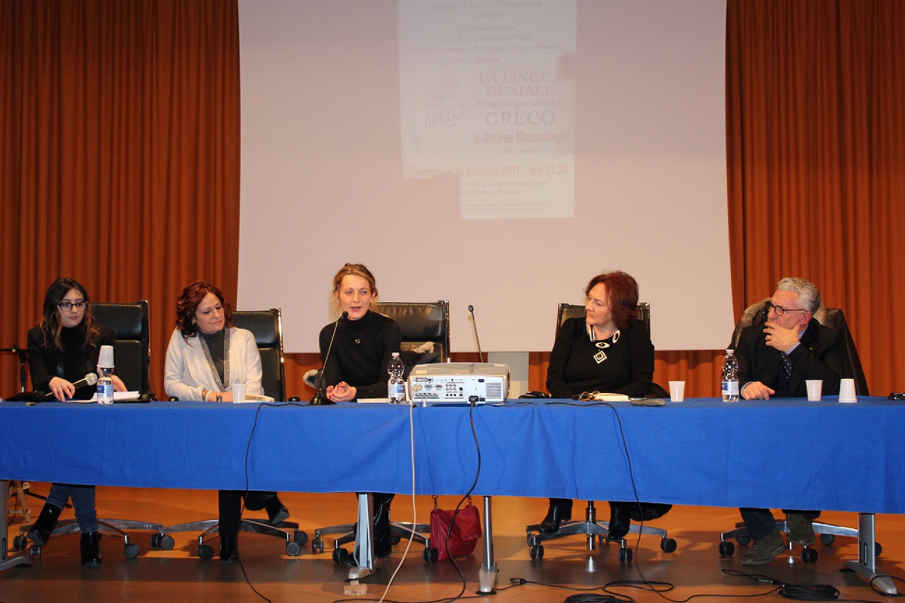FASANO – In un auditorium gremito di menti curiose, sull’onda delle belle emozioni suscitate dalla “Notte del liceo classico” che si è vissuta anche a Fasano tre giorni fa, ieri pomeriggio (domenica 15 gennaio) il Presidio del Libro di Fasano, in collaborazione con l’I.I.S.S. “Leonardo da Vinci” e la scuola secondaria di primo grado “Bianco – Pascoli”, ha voluto presentare “La lingua geniale. 9 ragioni per amare il greco”, un prezioso libro per ragazzi (e non solo) scritto da Andrea Marcolongo ed edito da Laterza, pubblicato a settembre ma ancora primo in classifica tra i saggi italiani. L’autrice è stata ospitata nella scuola diretta da Stella Carparelli, che ha voluto ribadire quanto la cultura classica sia un patrimonio genetico collettivo, come emerge anche nel testo della Marcolongo assieme a tutto il suo amore per il sapere.