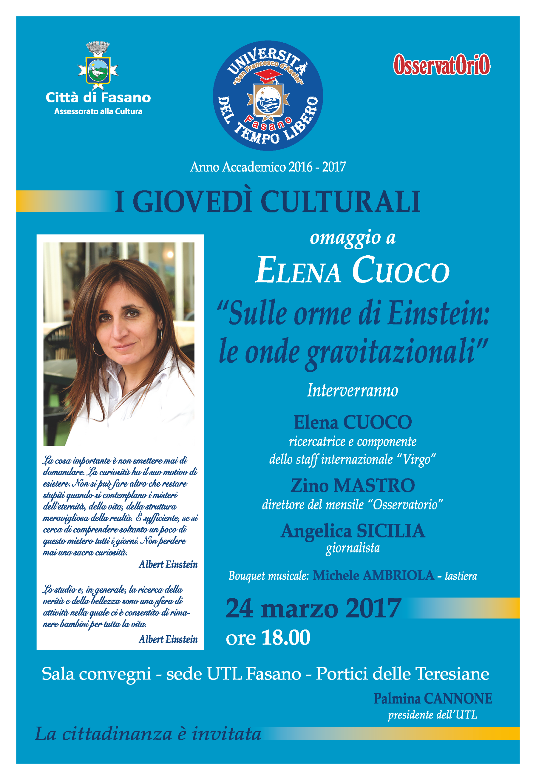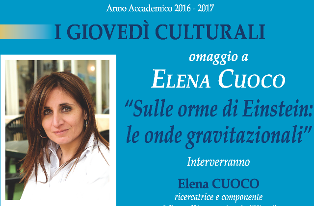La dott.ssa Cuoco tratterà il tema “Sulle orme di Einstein: le onde gravitazionali”. Interverranno: Palmina Cannone, presidente dell'UTL; il prof. Piero Pellegrini, ex docente di Elena Cuoco; Zino Mastro, direttore di “Osservatorio”; Angelica Sicilia, giornalista. Animerà la serata il musicista Michele Ambriola.