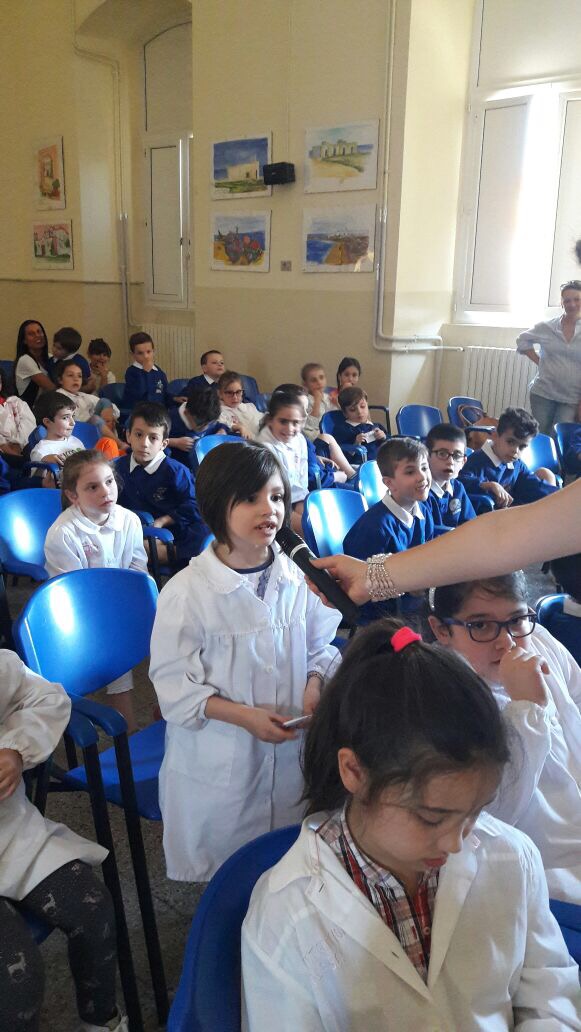 “La musica nasce dal silenzio…” ha affermato l’artista e, con una serie di giochi ritmici, ha fatto ben comprendere tale concetto ai ragazzi. Domandare ai bambini di non battere il tempo tutti nello stesso momento, presuppone da parte loro un ascolto molto attento e la comprensione del concetto di silenzio e pausa. Dopo aver suddiviso la platea degli alunni in due parti Alabanese ha saputo mantenere viva l’attenzione dei partecipanti, creando giochi ritmici, sviluppando la capacità d’ascolto dell’altro gruppo accordato al proprio, tramite il battito delle mani in maniera metrica. Subito dopo i bambini si sono trasformati in piccoli giornalisti assetati di informazioni sulla professione e lo stile di vita di Giorgio Albanese, ponendo semplici quesiti.