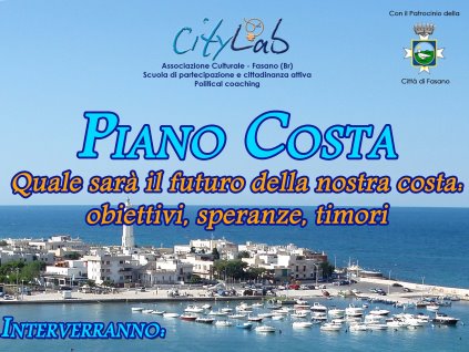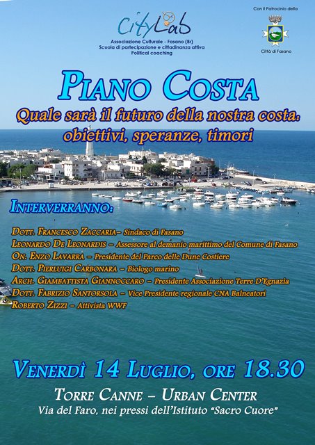 FASANO – L’associazione culturale CityLab Fasano, scuola di partecipazione e cittadinanza attiva, organizza per domani (venerdì 14 luglio), alle ore 18.30, presso l’ Urban Center di Torre Canne, struttura sita in via Del Faro, nei pressi della colonia Sacro Cuore, la tavola rotonda: “Piano Costa. Quale sarà il futuro della nostra costa: obiettivi, speranze, timori".