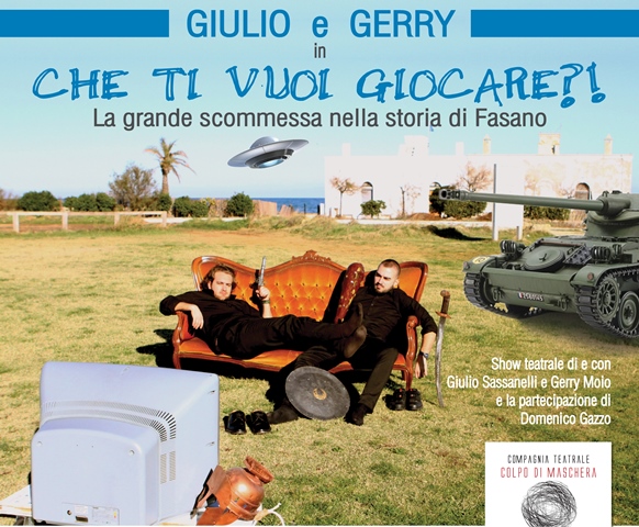 FASANO – Non è Natale se la Compagnia Colpo di maschera non sforna il suo ‘teatropanettone’. Per il terzo anno consecutivo il duo comico fasanese “Giulio e Gerry” sarà di scena al Teatro Sociale con uno spettacolo originale di satira locale. “Che ti vuoi giocare?!” è il titolo del nuovo esilarante show di Giulio Sassanelli e Gerry Moio, affiancati sul palco per l’occasione da Domenico Gazzo, che racconterà in maniera scanzonata e irriverente la fantomatica vicenda de ‘La grande scommessa nella storia di Fasano’. La direzione artistica dello spettacolo è di Mimmo Capozzi, supportato alla regia tecnica da Rossella e Melania De Mola, e dal videomaker Mimmo Leogrande. Sono previste ben undici date, dal 26 al 30 dicembre 2017 e dal 2 al 7 gennaio 2018 (porta ore 20.30 e sipario ore 21; nei festivi 26 dicembre, 6 e 7 gennaio porta ore 18.30 e sipario ore 19).
