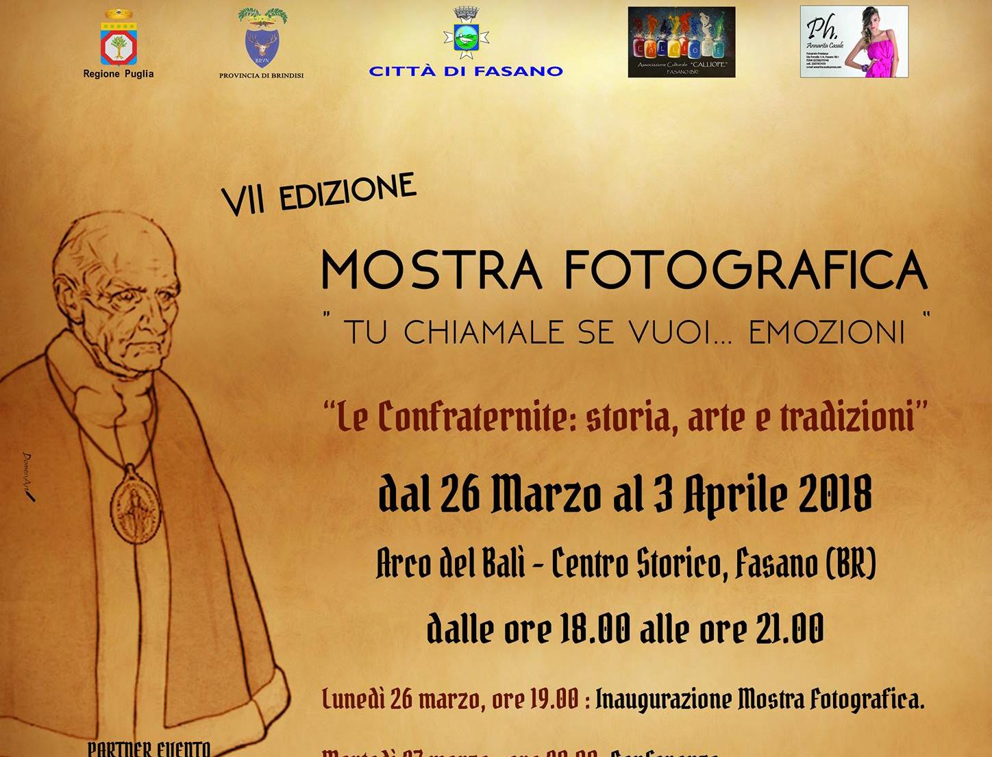 FASANO – L’Associazione Culturale “Calliope”, presieduta da Mariateresa Maggi e la fotografa Freelance Annarita Casale, organizzano la settima edizione della Mostra Fotografica “Tu chiamale se vuoi… Emozioni”- “Le Confraternite: storia, arte e tradizioni.” , in collaborazione con l’Università del Tempo Libero “S. Francesco D’ Assisi” presieduta da Palmina Cannone, la Confraternita di San Giuseppe presieduta da Tommaso Narducci e l’associazione “U’mbracchie” presieduta da Vito Ventrella, con il patrocinio della Regione Puglia, della Provincia di Brindisi e del Comune di Fasano.