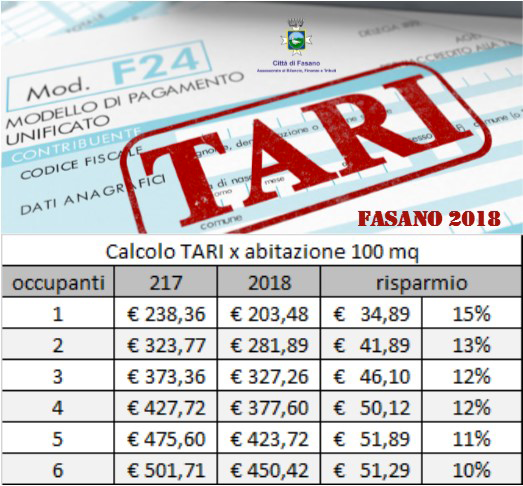 FASANO – In questi giorni l’Ufficio Tributi comunale sta inviando gli avvisi TARI 2018, per lettera alle famiglie e via PEC alle imprese. Chi non dovesse ricevere la comunicazione può rivolgersi agli uffici. I contribuenti potranno scegliere se effettuare il pagamento in un unico versamento o in quattro rate. Per tutte le soluzioni troveranno il modello F24 pre-compilato. Le importanti riduzioni del tributo rispetto al 2017 che tutte le famiglie potranno agevolmente riscontrare sono il frutto anche della volontà di molti contribuenti che hanno spontaneamente regolarizzato le proprie posizioni. A queste si aggiungono le esenzioni pressoché totali alle 696 utenze che hanno fatto istanza di agevolazione su base ISEE, misura che l’Amministrazione ha fortemente voluto a sostegno dei nuclei familiari.
