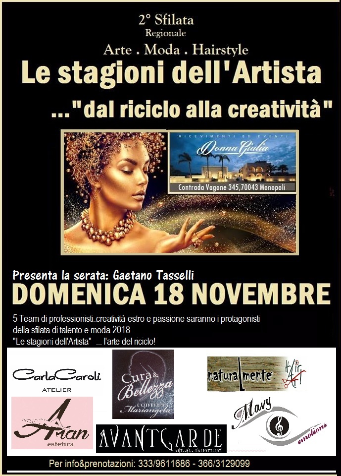 Fasano – Questa sera nella cornice della sala da ricevimenti Donna Giulia si svolgerà la 2° Sfilata Regionale Le stagioni dell'Artista …"dal riciclo alla creatività". L'evento, organizzato dalla fasanese Antonella Sava coadiuvata dall'Ass. musicale Mavy Emotion di Fasano, è una competizione di moda, arte e hayrstyle che vedrà impegnati ben cinque team.