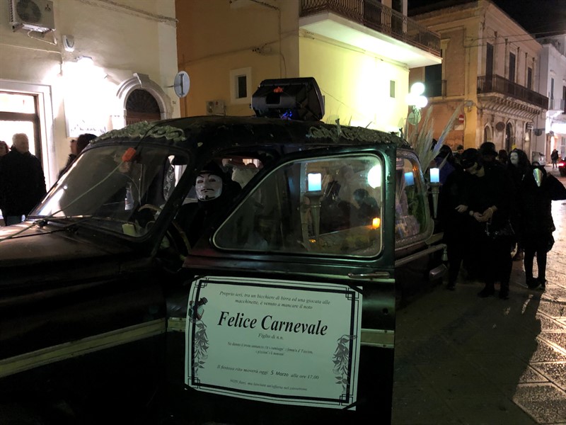 A Fasano il “Carnevale dei Bambini” è organizzato dalla Parrocchia S. Francesco d’Assisi in collaborazione con numerose realtà del territorio. A sfilare sono stati ben sette carri allegorici: “I Clown”, realizzato e animato dall’asilo nido “L’Isola che non c’è”; “Topolino”, “Kinder” e il “carro della Pace” messi a punto dalla parrocchia; “Aladdin” realizzato dall’Oratorio del Fanciullo e il “carro dell’amore”. Ieri sera però ha preso parte alla sfilata anche la banda giovanile “S. Cecilia” e un folto gruppo che piangeva il signor Felice Carnevale, che giaceva all’interno del carro funebre, a dare il triste annuncio del suo passaggio a miglior vita “t’tt i cumbagn’, i femm’n d’ Fascion, i p’ccinn’ i li nononn’” si leggeva sul manifesto.