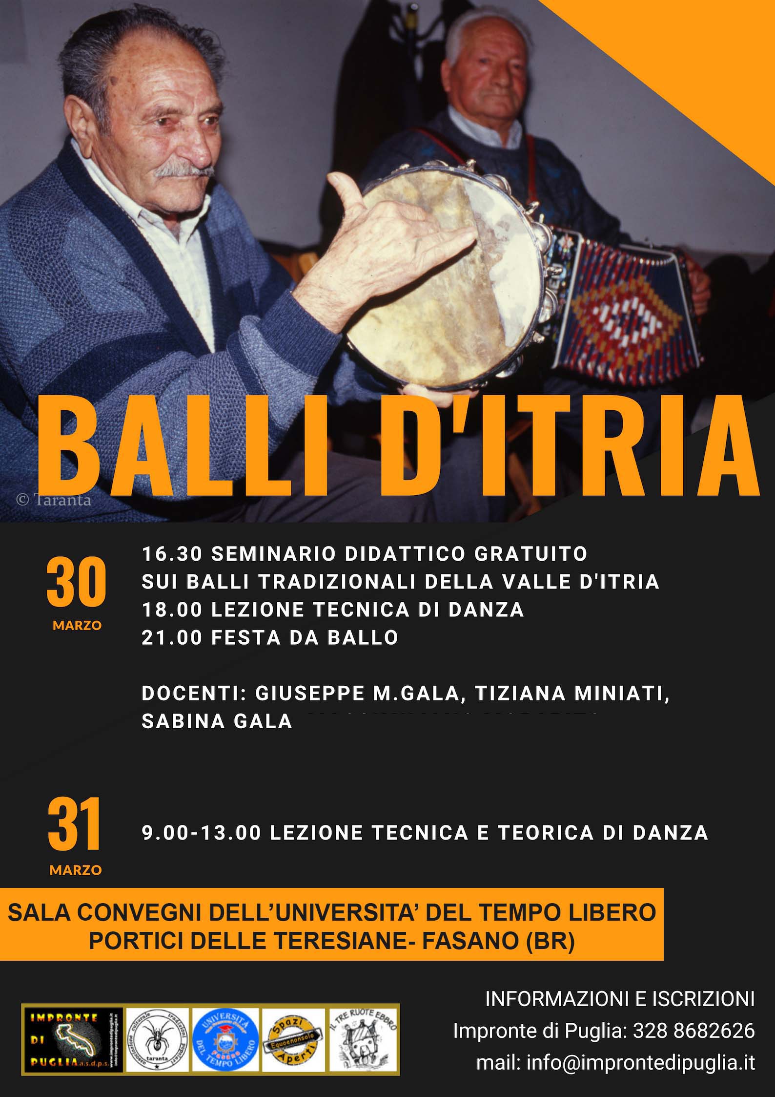 Fasano – Il 30 e 31 marzo 2019 si terrà, presso la sala dei convegni dell’UTL di Fasano (Portici delle Teresiane ), un interessantissimo seminario sui balli della Valle d’Itria o area dei trulli. Per la prima volta Pino Gala (Docente di Lettere e Antropologo della danza, importante ricercatore di danze popolari in Puglia e in Italia) torna in Valle d’Itria a restituire alle nuove generazioni quei balli osservati, documentati e appresi durante l’indagine etnografica di qualche decennio fa. Un’occasione quindi preziosa per attingere forme e cultura del ballo locale fra tre province: Brindisi, Taranto e Bari.