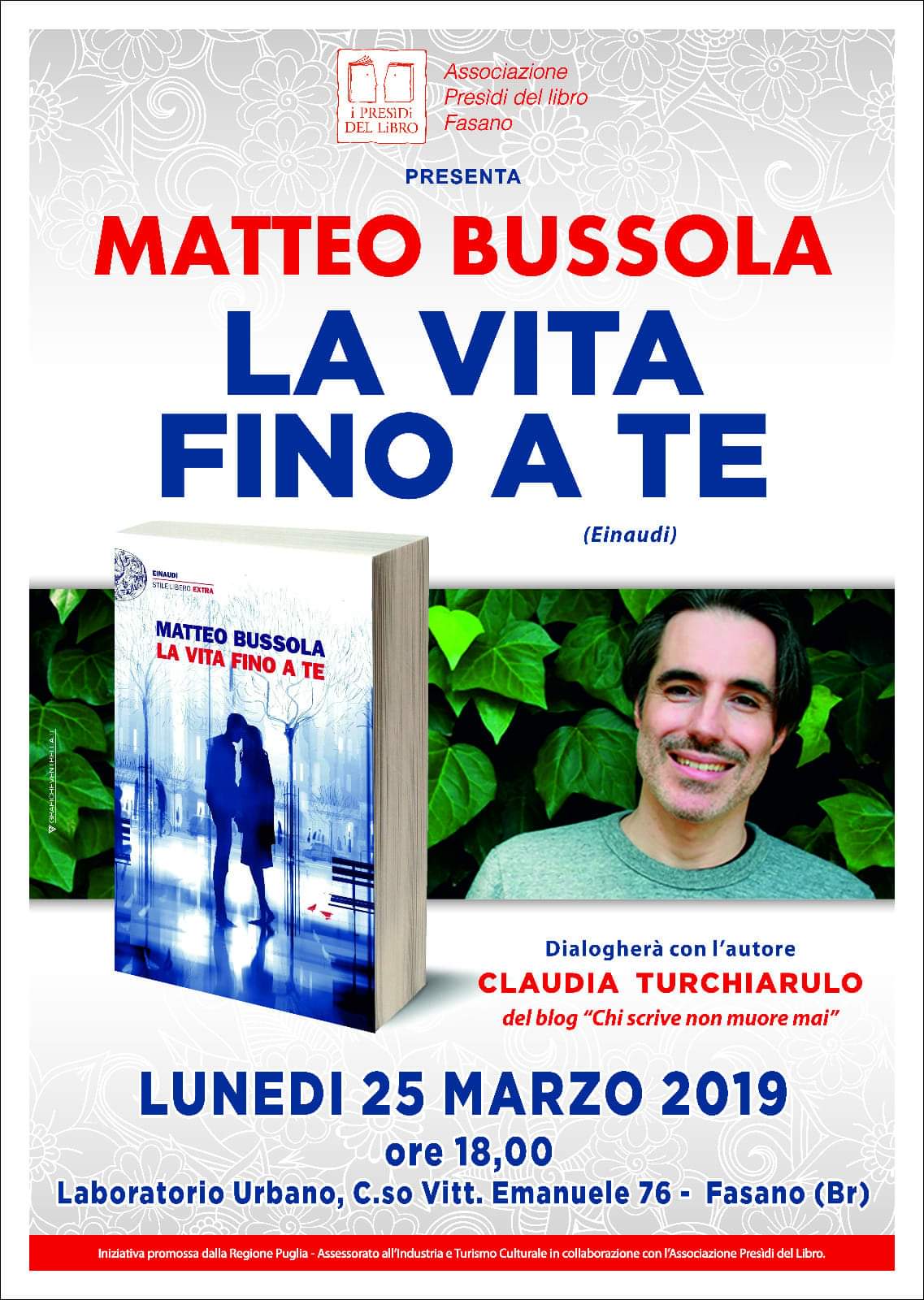 Lunedì 25 marzo presso il Laboratorio Urbano, a partire dalle ore 18, in corso Vittorio Emanuele, Matteo Bussola presenta il suo ultimo romanzo “La vita fino a te”, Einaudi Editore. Lo scrittore, fumettista e speaker radiofonico veronese torna in libreria, dopo il successo “Notti in bianco, baci a colazione”, con un libro che parla dell’amore di coppia, quello vissuto, immaginato, fallito e inseguito. Dialogherà con l'autore Claudia Turchiarulo, autrice del blog "chi scrive non muore mai".