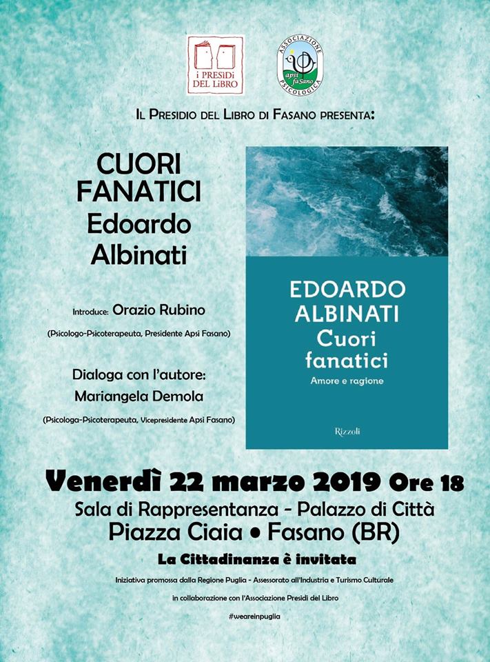 Venerdì 22 marzo Edoardo Albinati presenta il nuovo romanzo “Cuori fanatici”, presso la Sala di Rappresentanza del Palazzo di Città, a partire dalle ore 18, Orazio Rubino, presidente Apsi Fasano introdurrà l'autore, Edoardo Albinati, il quale dialogherà con Mariangela Demola.