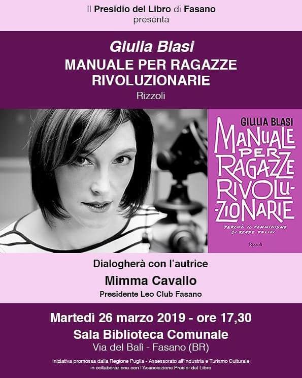 Martedì 26 marzo il Presidio del Libro di Fasano ospita la scrittrice, friulana di origine ma romana di adozione, Giulia Blasi con il suo ultimo romanzo "Manuale per Ragazze rivoluzionarie". La presentazione del librò è organizzata presso la Sala Congressi della Biblioteca Comunale in via Arco del Balì a partire dalle ore 17:30. Dialogherà con l'autrice, la presidente del Leo Club Fasano, Mimma Cavallo.