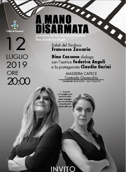 "oggi, venerdì 12 luglio alle ore 20.00 presso Masseria Capece avremo la possibilità di ospitare la scrittrice Federica Angeli e l'attrice Claudia Gerini,  per fruire della visione del film " A mano disarmata " tratto dall'omonimo romanzo e confrontarci con loro sul tema della criminalità organizzata e di quanto questa pericolosamente si intrecci nella società e nella cultura di un luogo fino a divenirne la normalità! – afferma il sindaco – mi auguro che la partecipazione sia massiccia e che sia occasione per riflettere con chi è impegnato in prima linea contro la mafia e contro il sentire mafioso.