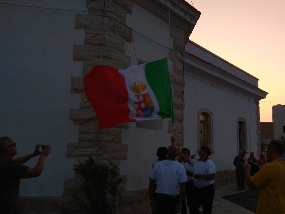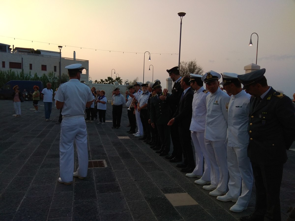Un cielo rosa e arancio è stato lo sfondo perfetto per la cerimonia dell’ammaia bandiera, curata da Gennaro Peluso (1° M.llo LGTR) e Salvatore Mercadante (S.C. 1° Cl), avvenuta al tramonto. A questo ha fatto eco la benedizione di don Luigi Bianchessi e la deposizione della corona dedicata ai caduti del mare, presso la cappella del Sacro Cuore di Gesù.