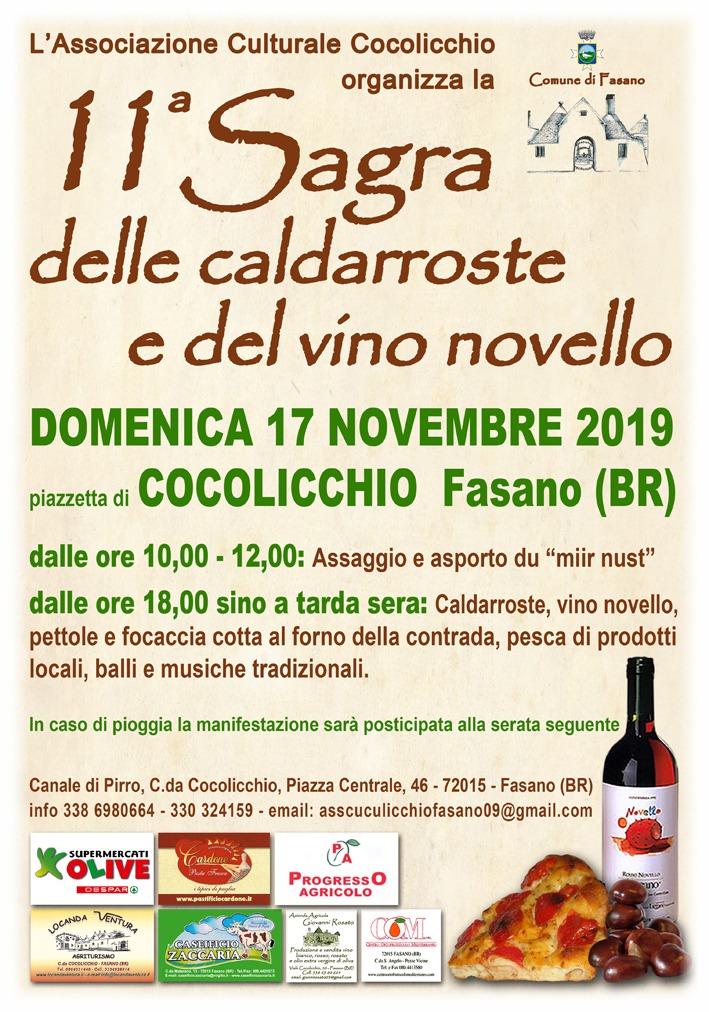 Fasano – Torna domenica 17 novembre, dalle ore 18:00, l'ormai tradizionale appuntamento organizzato dall'Associazione Culturale Cocolicchio con la Sagra delle Caldarroste e del Vino novello, giunto quest'anno alla 11ª edizione.