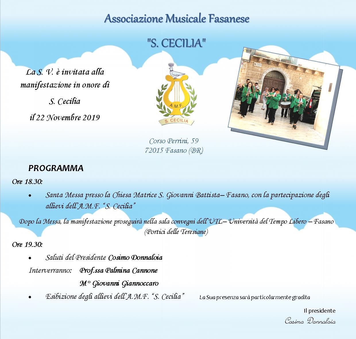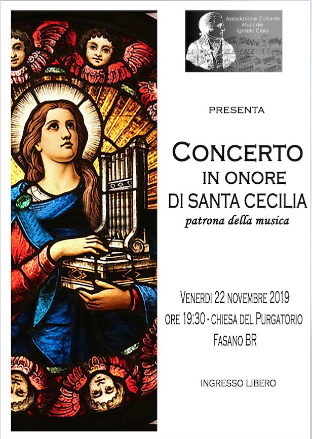 A Fasano il culto di Santa Cecilia è parecchio sentito grazie alle bande che da ormai molti anni operano all’interno dell’ambiente cittadino e che nella giornata del 22 novembre organizzano eventi musicali per celebrare degnamente la propria Patrona. L’Associazione Musicale Fasanese “S. Cecilia” ha messo a punto ben due appuntamenti: alle ore 18.30 sarà celebrata la Santa Messa presso la Chiesa Matrice con l’animazione liturgica eseguita dagli allievi dell’AMF “S. Cecilia”; a seguire i festeggiamenti continueranno presso la sede dell’Università del Tempo Libero presso i portici delle teresiane dove, a partire dalle ore 19.30, ci saranno gli interventi dello storico presidente dell’AMF Cosimo Donnaloia, della prof.ssa Palmina Cannone e del maestro Giovanni Giannoccaro, arricchiti dagli intervalli musicali eseguiti dai giovani musicisti.