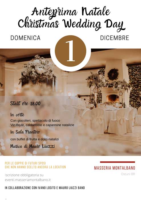 Fasano – Domenica 1° dicembre presso la storica e suggestiva location di Masseria Montalbano si svolgerà un evento dedicato alle coppie di futuri sposi che non hanno ancora scelto la location per il proprio matrimonio: "Anteprima Natale – Christmas Wedding Edition".
