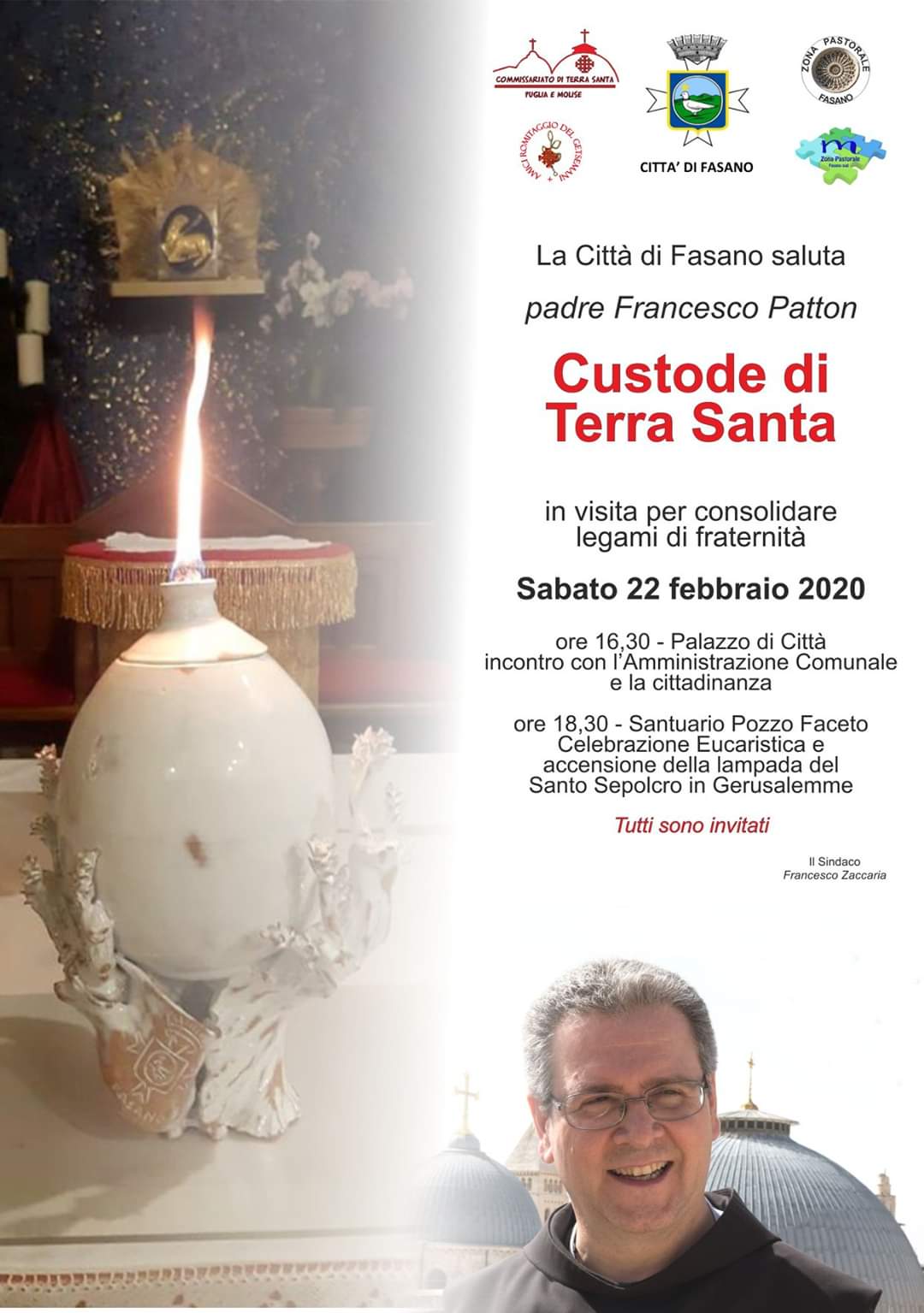 Fasano – Padre Francesco Patton Custode di Terra Santa sarà in visita a Fasano sabato 22 febbraio. La Cerimonia di saluti alla Città si terrà alle ore 16.30 presso il Palazzo di Città. L’incontro proseguirà poi alle ore 18.30 presso il Santuario di Pozzo Faceto per la Celebrazione Eucaristica e l’accensione della lampada del Santo Sepolcro in Gerusalemme.