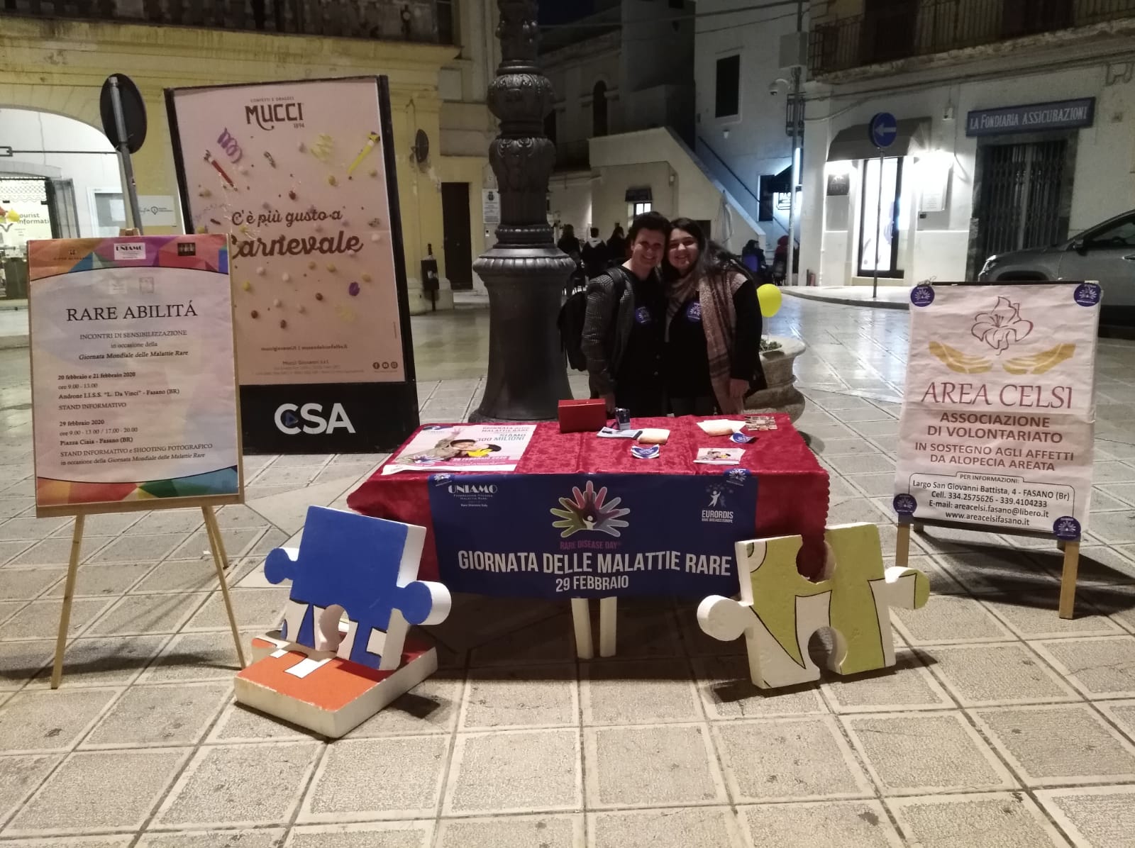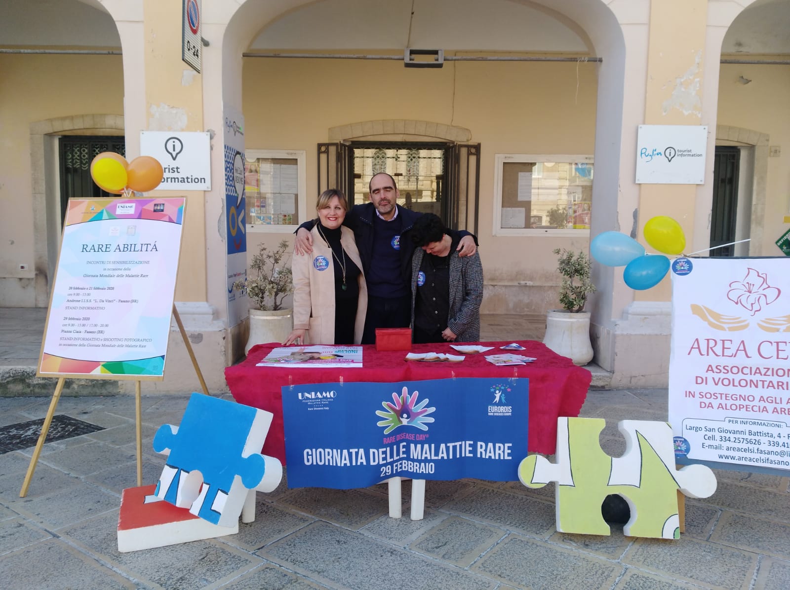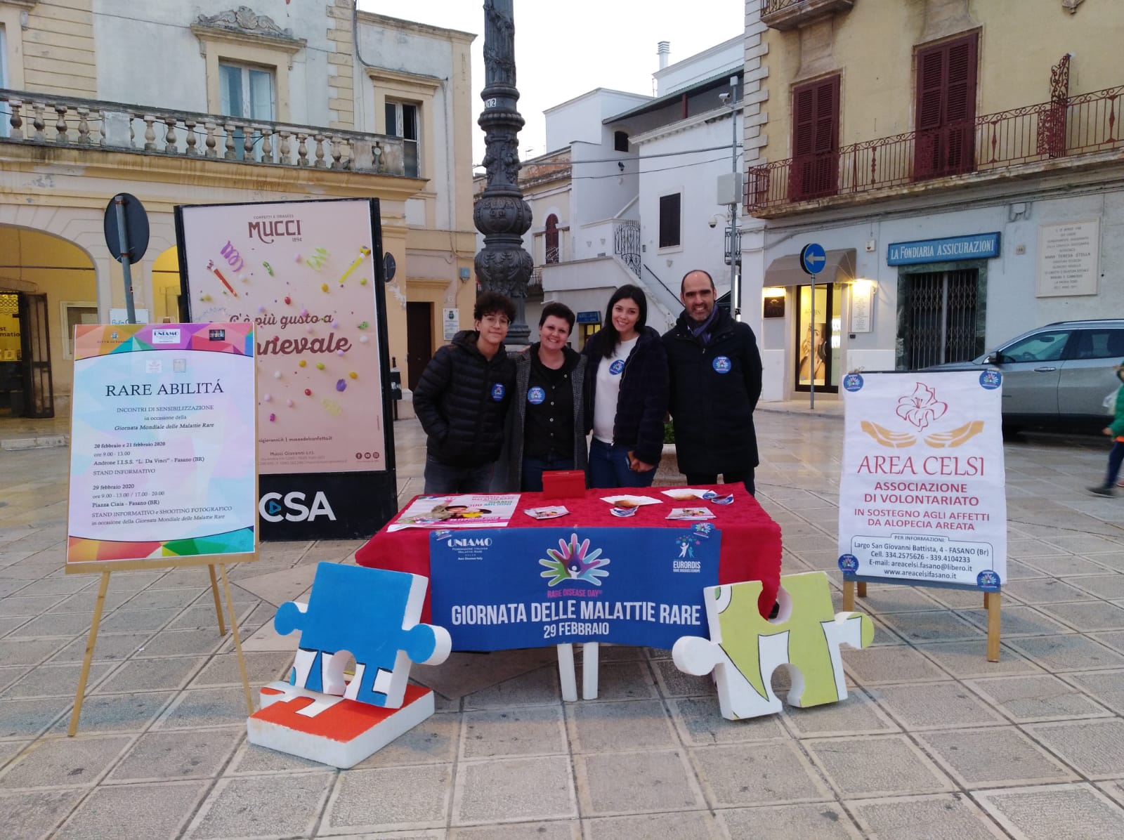 Fasano – Ieri, sabato 29 febbraio, si è celebrata la Giornata Mondiale delle Malattie Rare. L’associazione Area Celsi, presieduta da Maria Teresa Maggi, ha allestito uno stand informativo in piazza Ciaia con lo scopo di sensibilizzare la cittadinanza sul tema delle malattie rare.